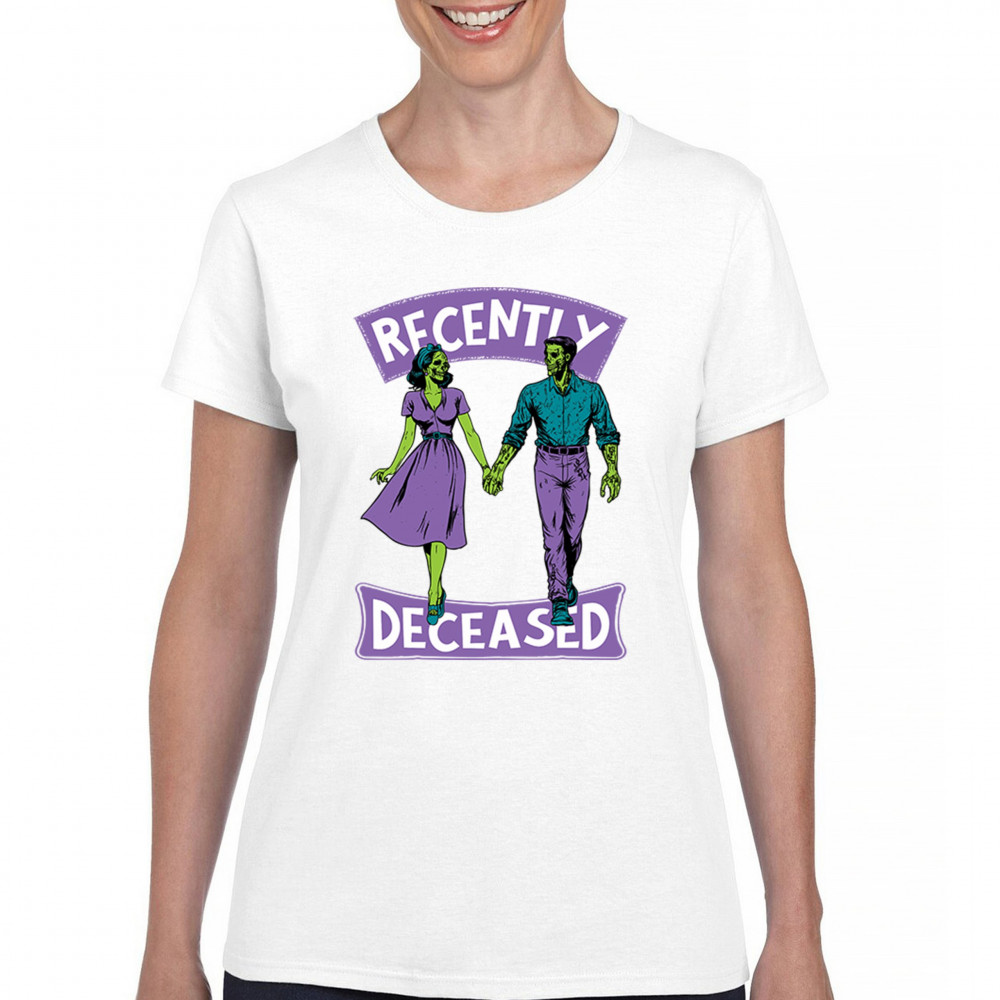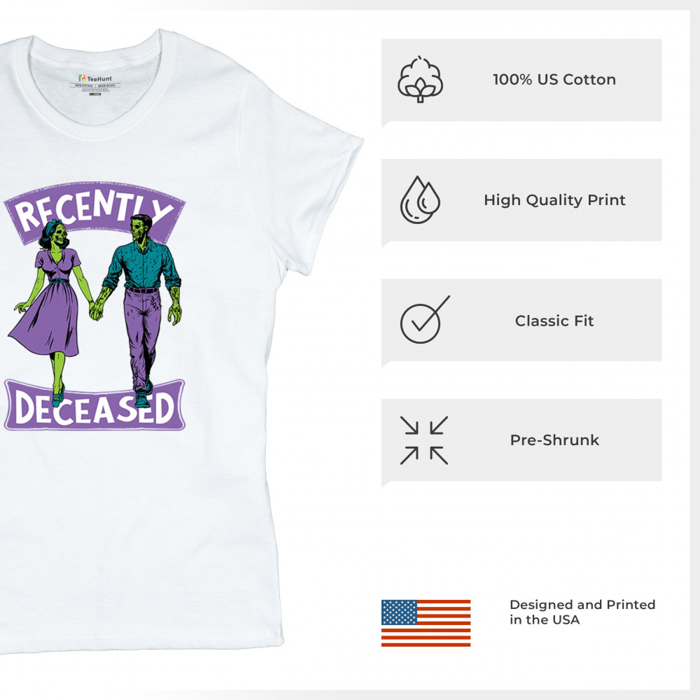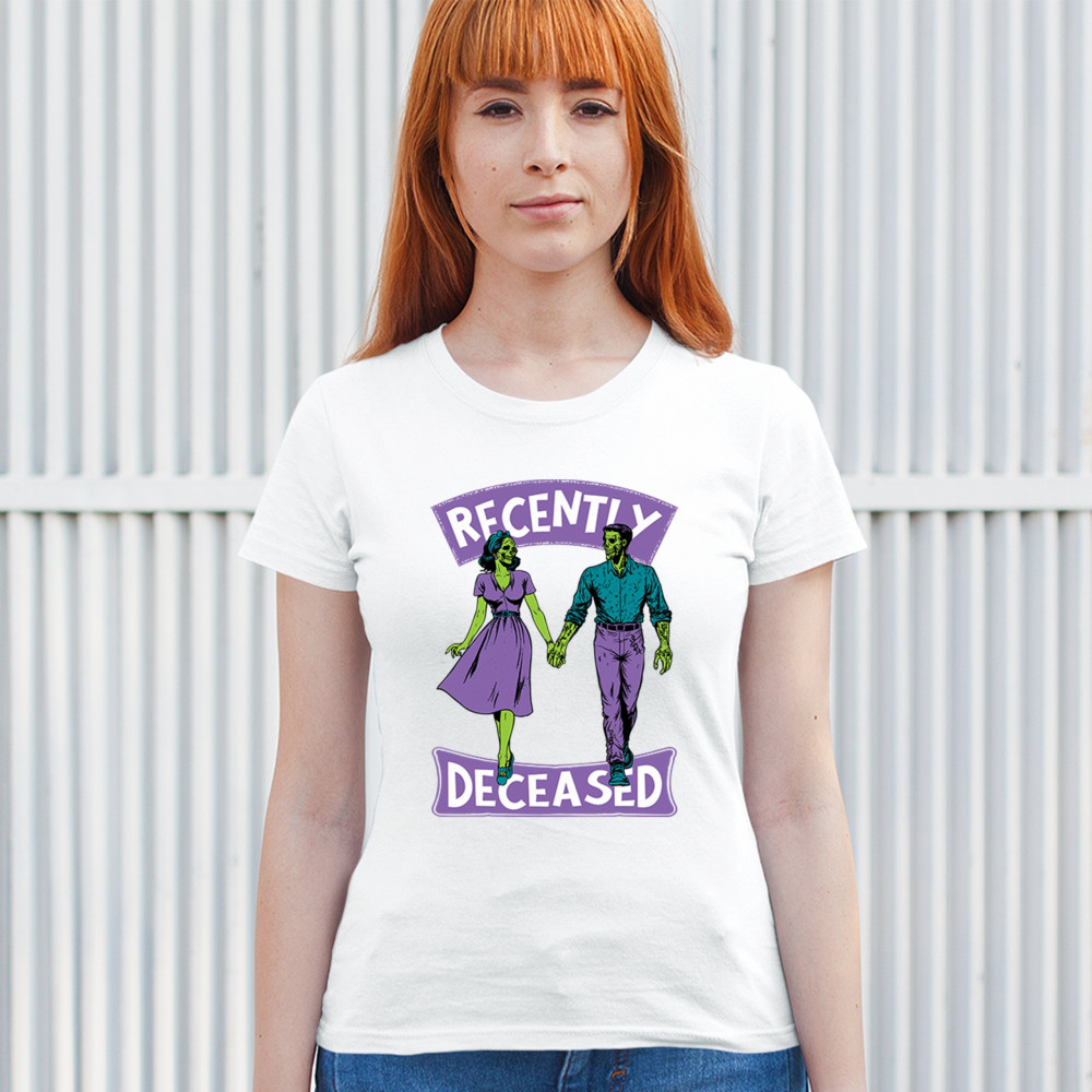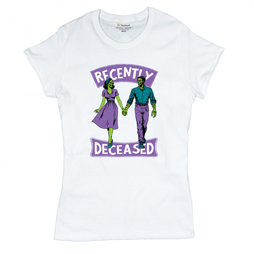 Recently Deceased zombie couple shirt with undead lovers design, spooky season humor, Halloween zombie outfit, and haunted house vibes.