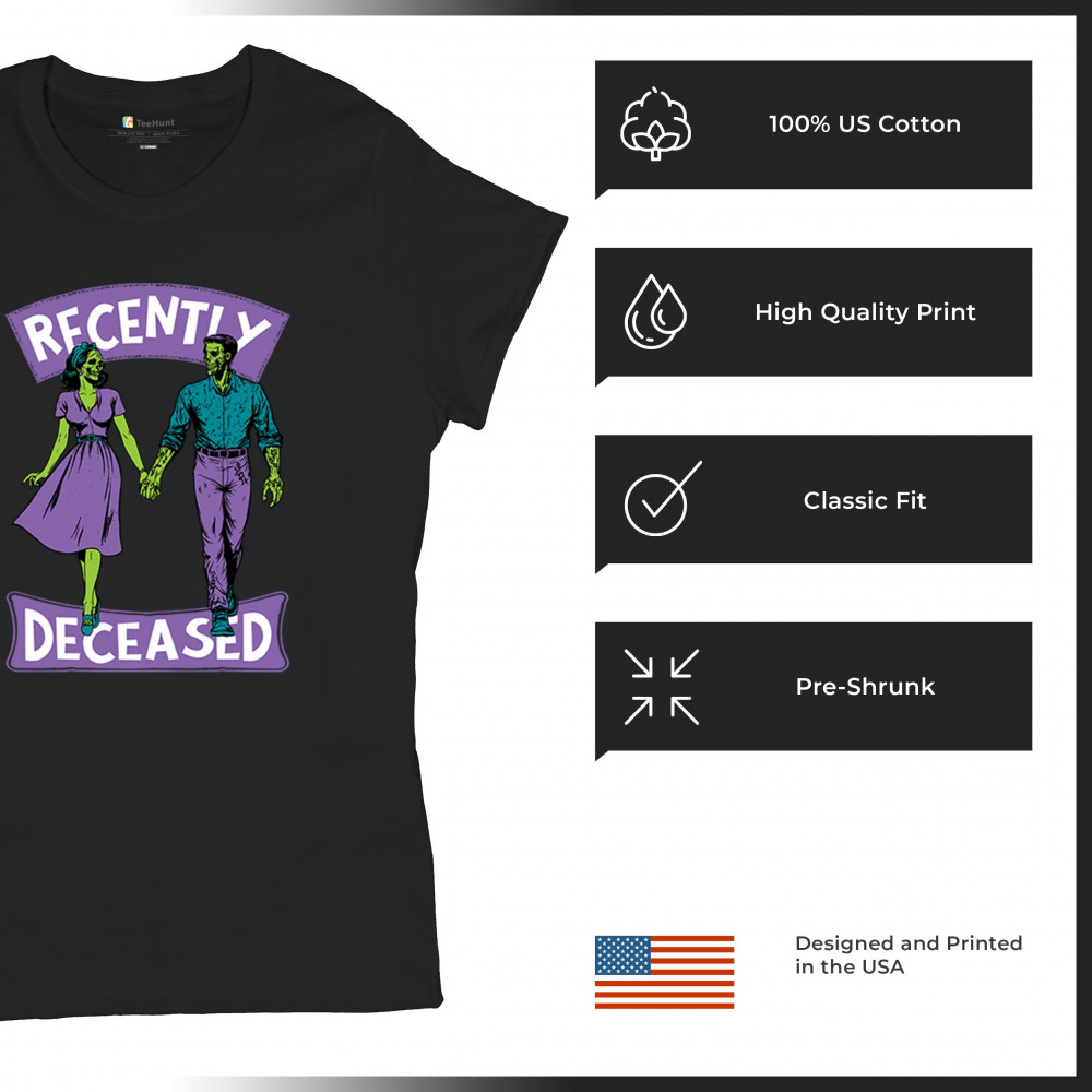 Recently Deceased zombie couple shirt with undead lovers design, spooky season humor, Halloween zombie outfit, and haunted house vibes.