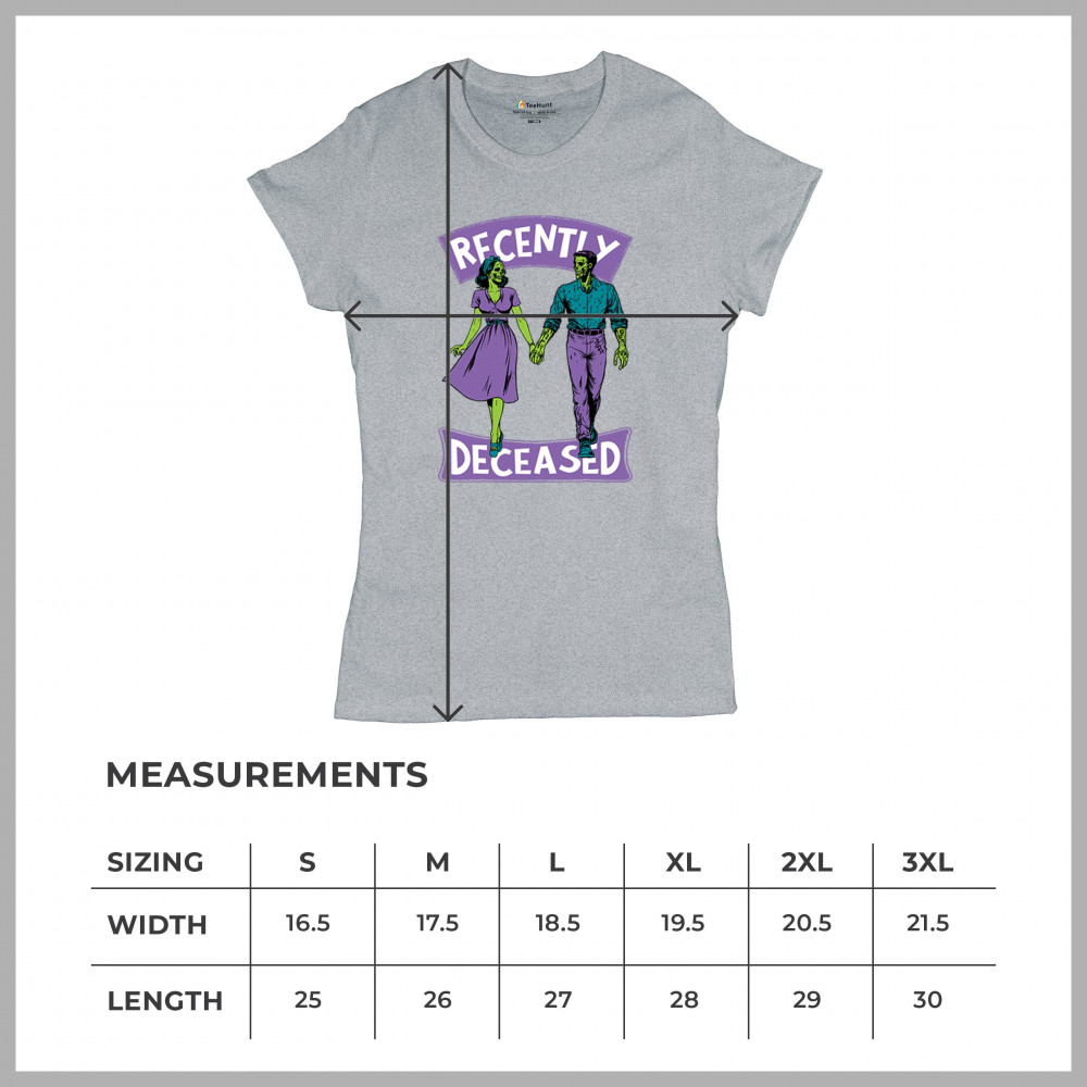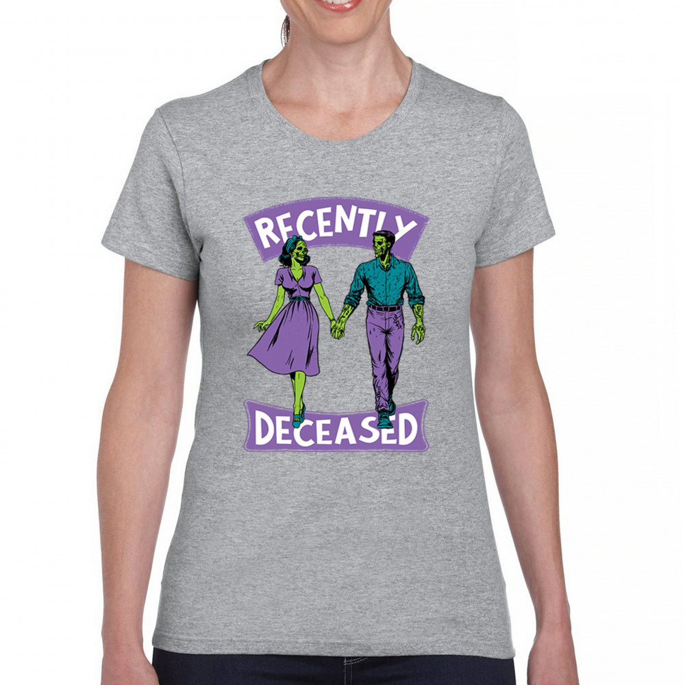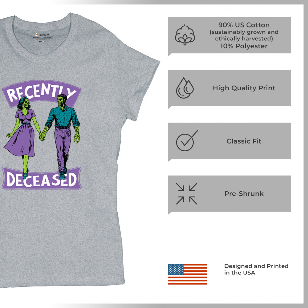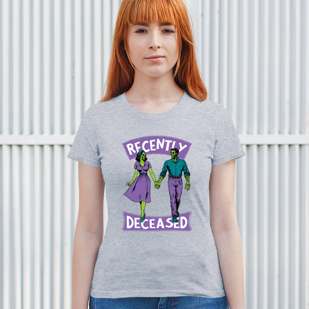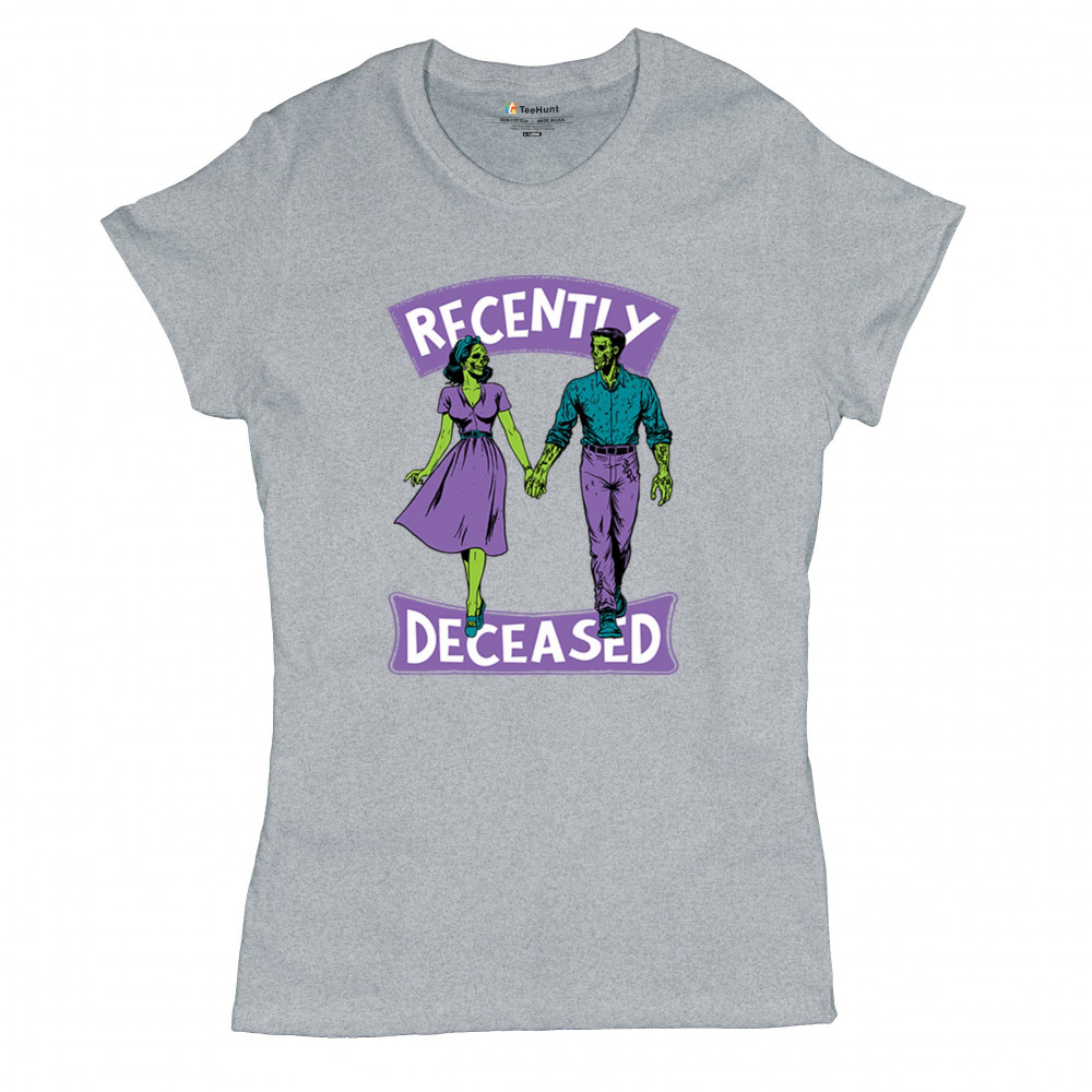 Recently Deceased zombie couple shirt with undead lovers design, spooky season humor, Halloween zombie outfit, and haunted house vibes.