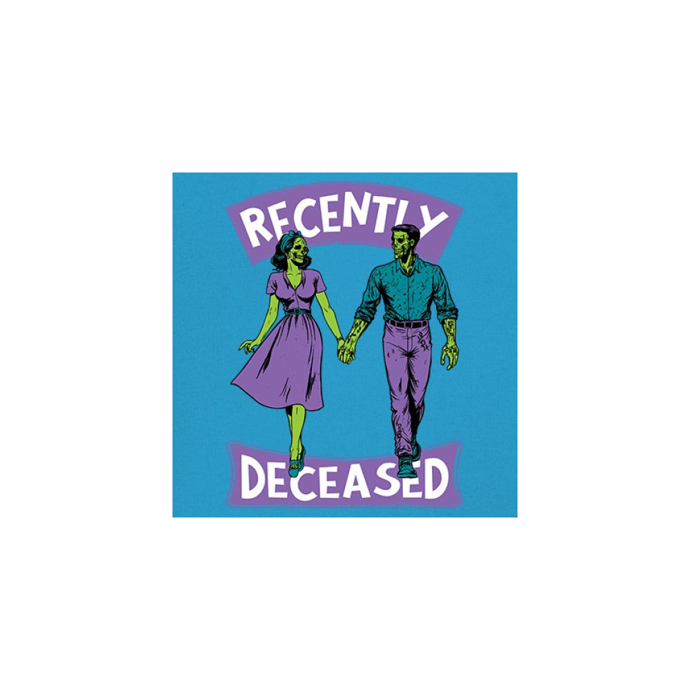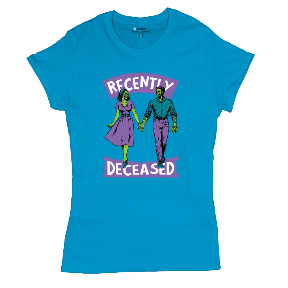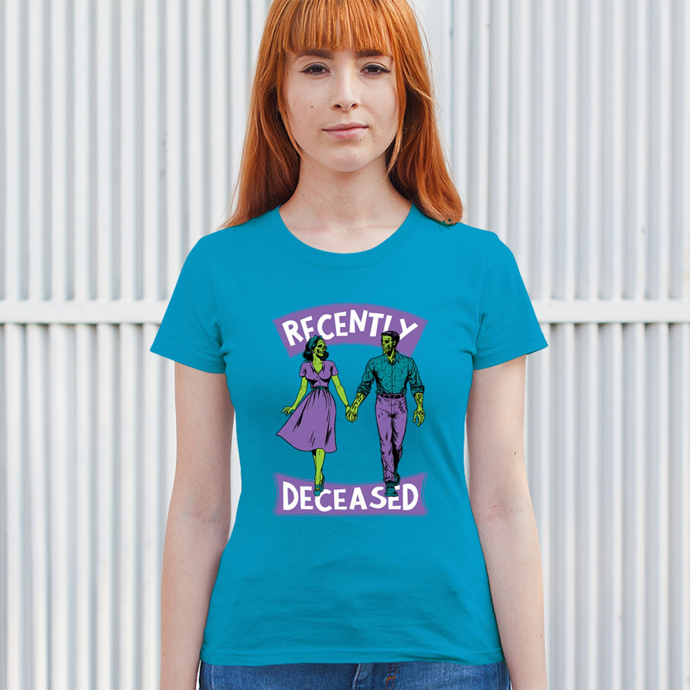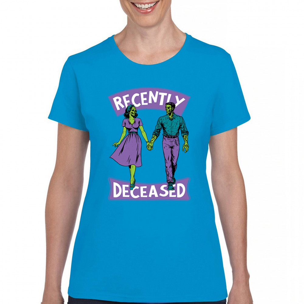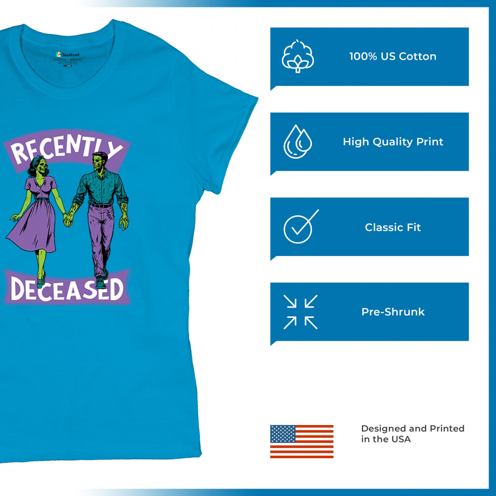 Recently Deceased zombie couple shirt with undead lovers design, spooky season humor, Halloween zombie outfit, and haunted house vibes.