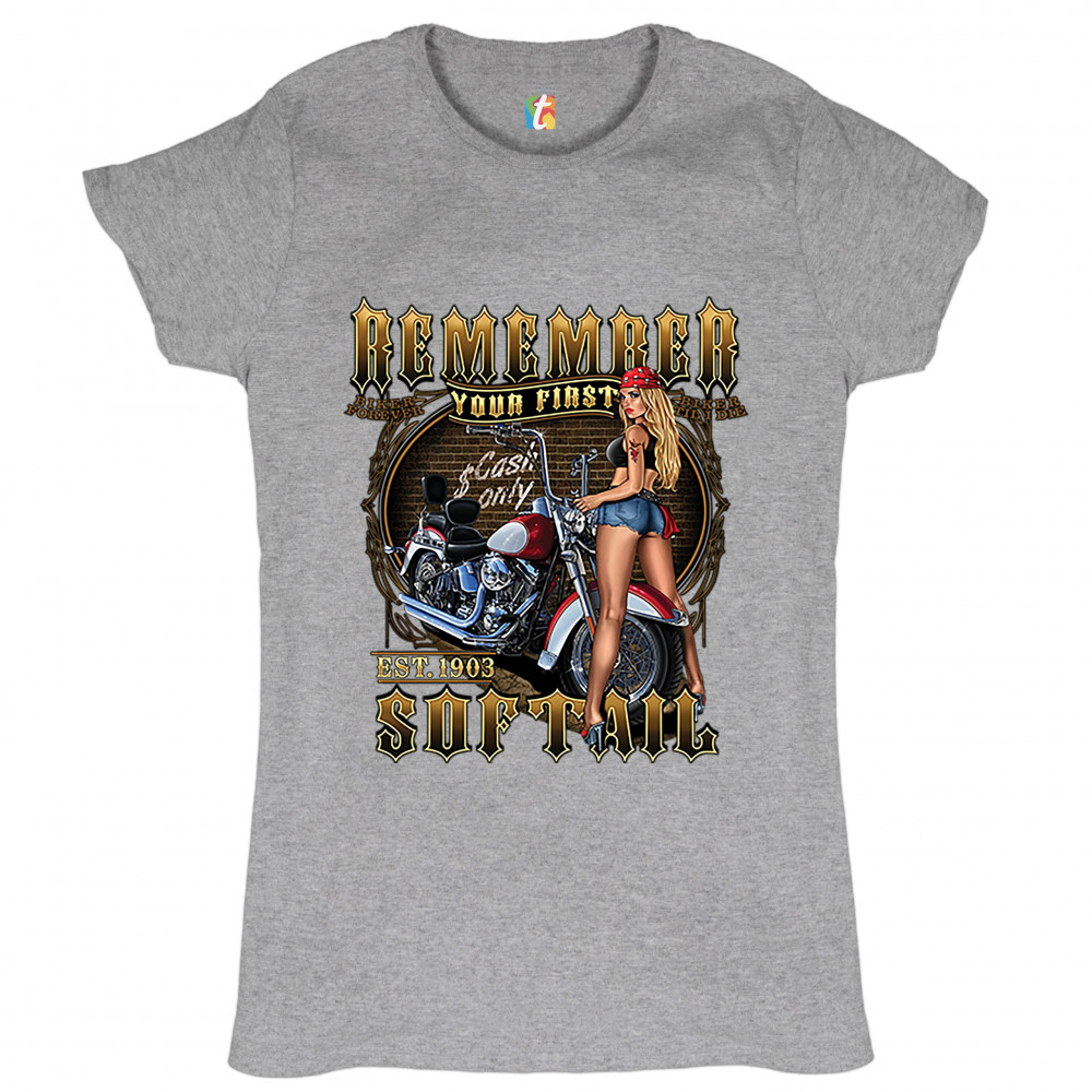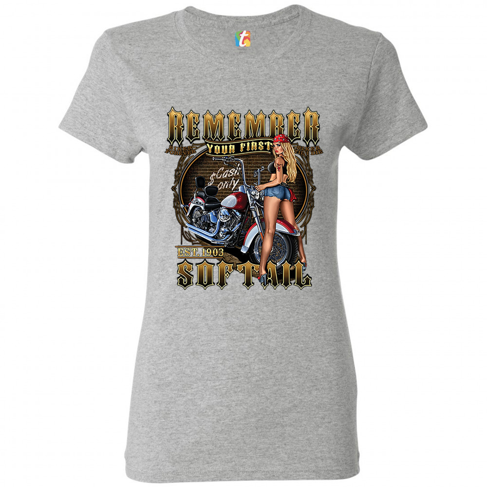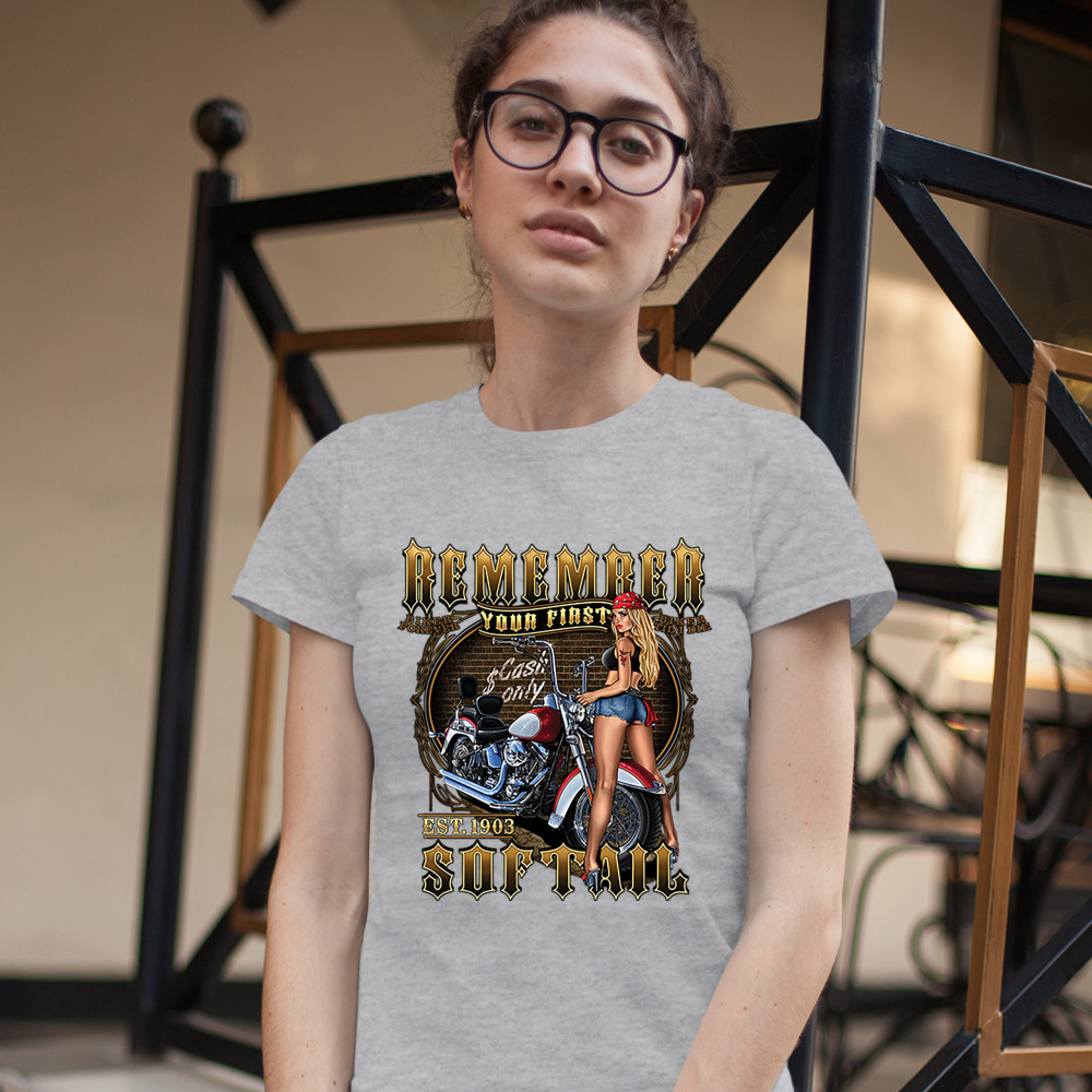 A print featuring a sexy pin-up girl in daisy dukes standing in front of a motorcycle. In the background there is a brick wall with "$ cash only" written on it. The print says: "Remember your first softail, biker forever, biker til i die, est. 1903". A gr