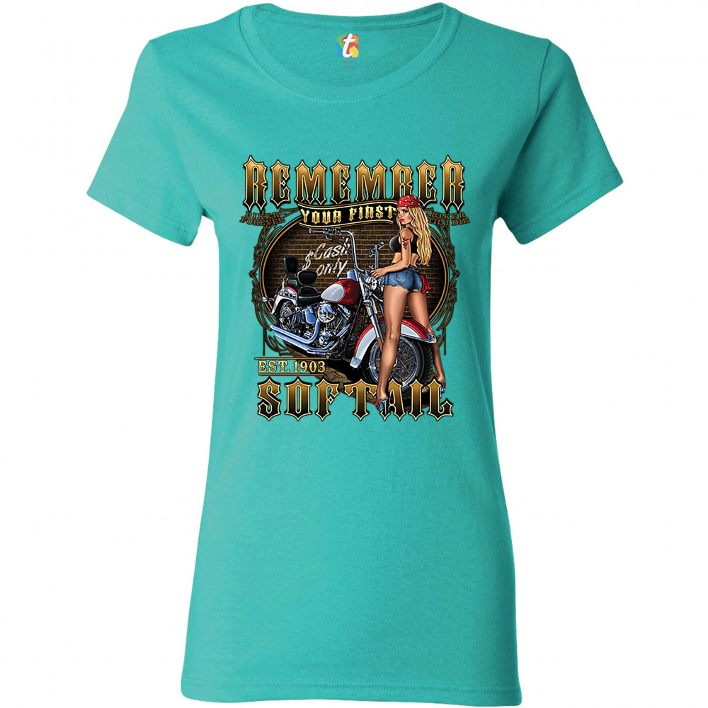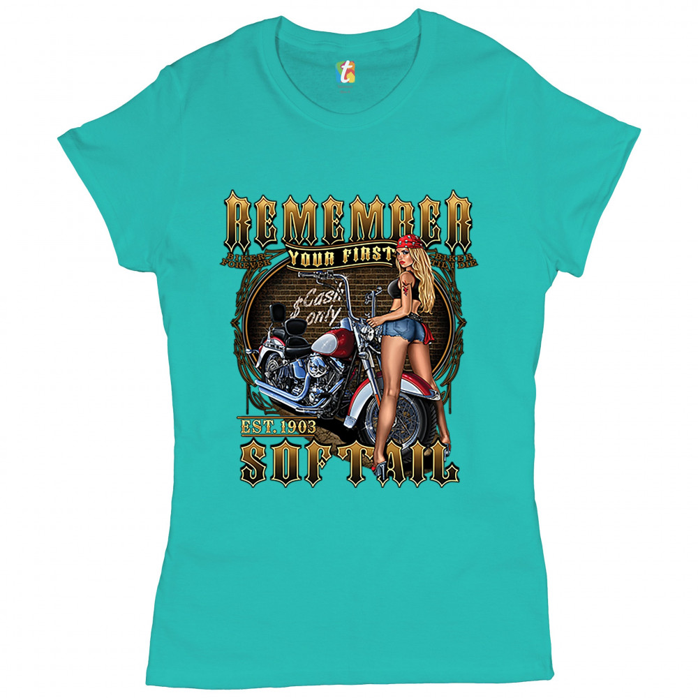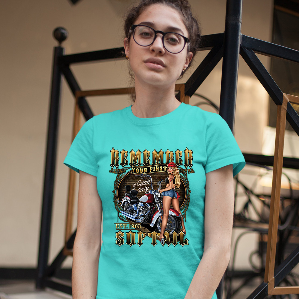 REMEMBER YOUR FIRST SOFTAIL t-shirt mc biker forever pin-up girl women's tee light blue