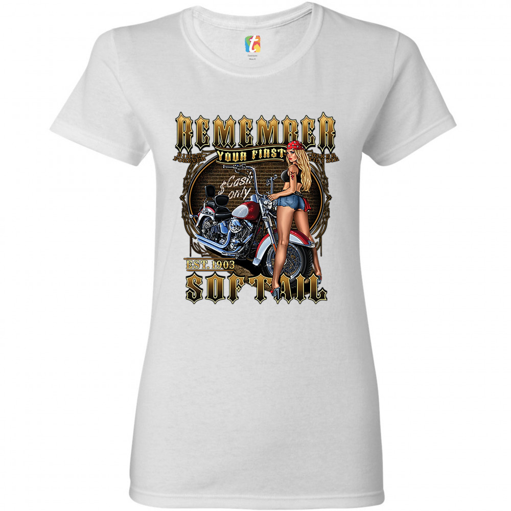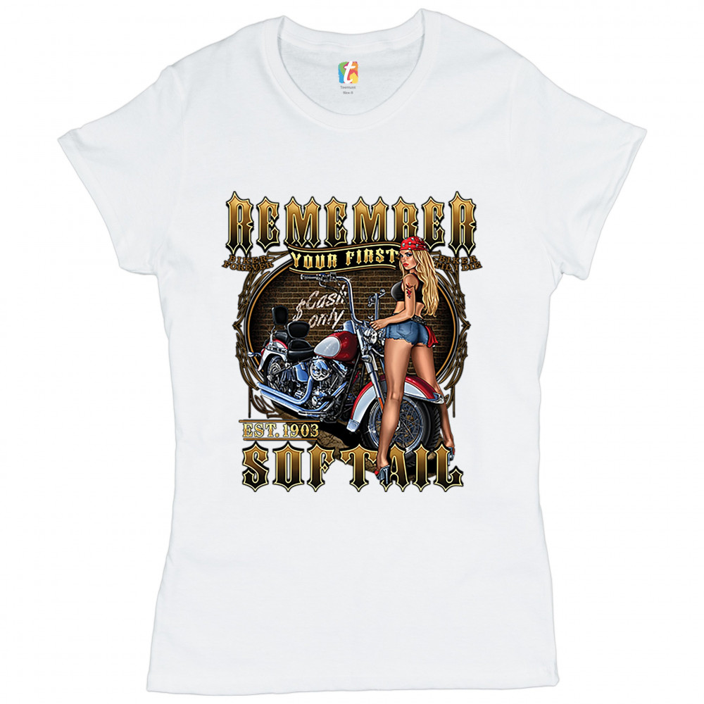 A print featuring a sexy pin-up girl in daisy dukes standing in front of a motorcycle. In the background there is a brick wall with "$ cash only" written on it. The print says: "Remember your first softail, biker forever, biker til i die, est. 1903". A gr