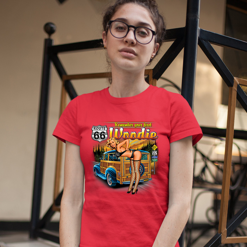A print featuring a sexy blonde pin-up girl bending over and taking off her bra. Behind her there is a woodie wagon driving on a road. The print says: "Remeber your first woodie" and features a Route 66. A great choice for a fan of the legendary Mother Ro