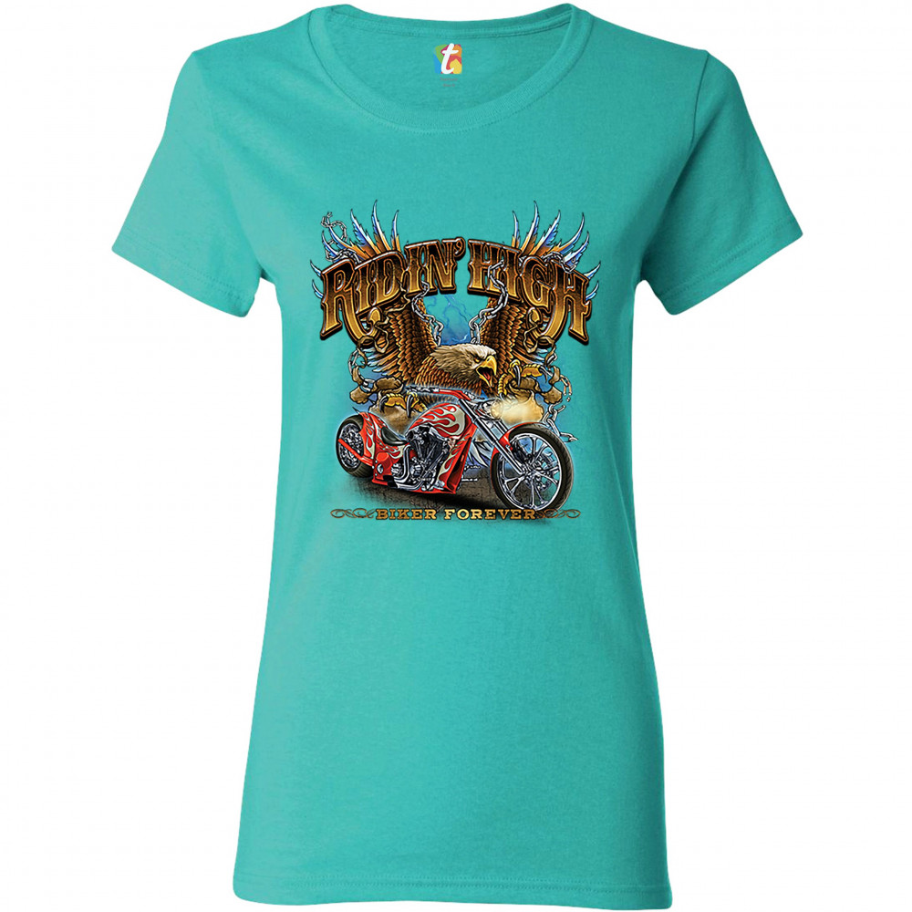 RIDIN' HIGH t-shirt biker forever chopper rider american eagle women's tee light blue