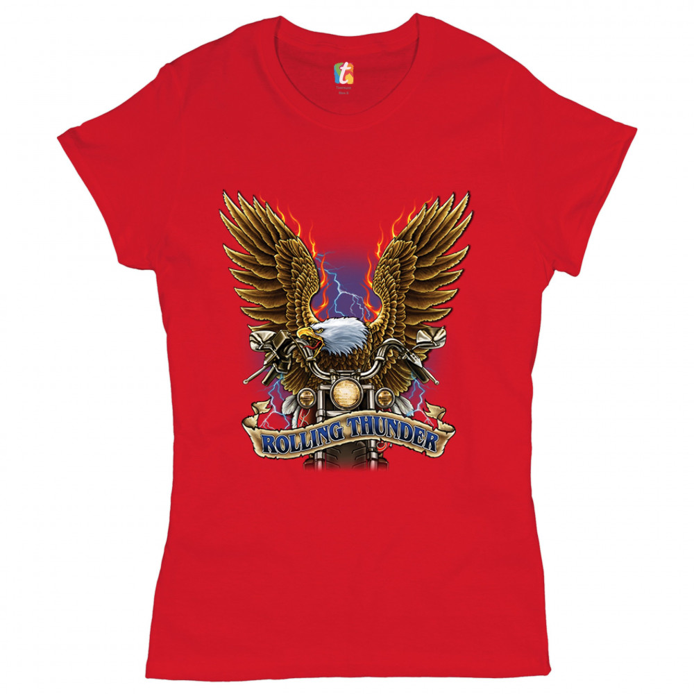 A print featuring an American bald eagle riding a motorcycle and spreading it's wings while they're on fire. In the background a lightning strikes. There is also stripe which says: "rolling thunder". A great choice for a motorcycle enthusiast.