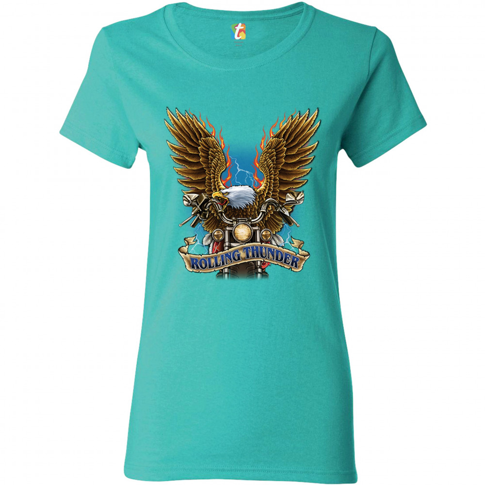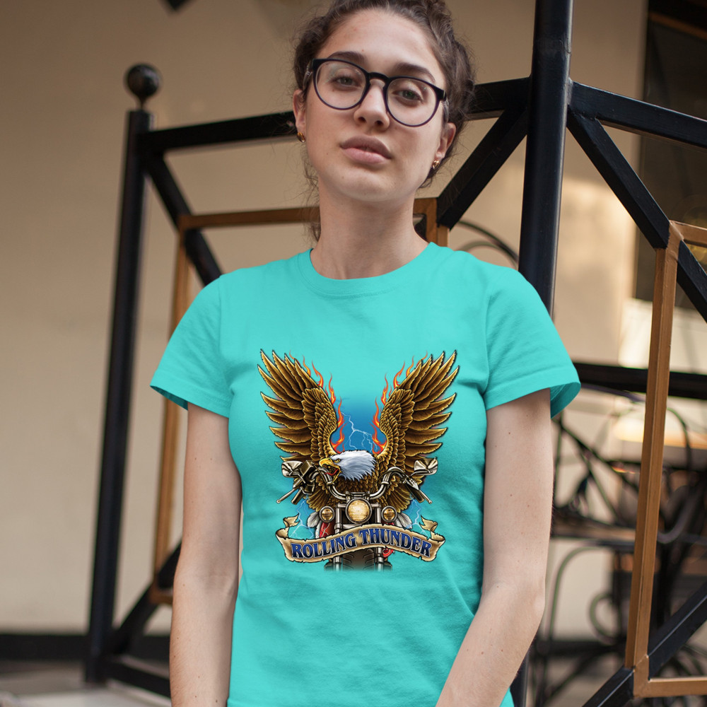 ROLLING THUNDER t-shirt biker born to be wild bald eagle outlaw women's tee light blue