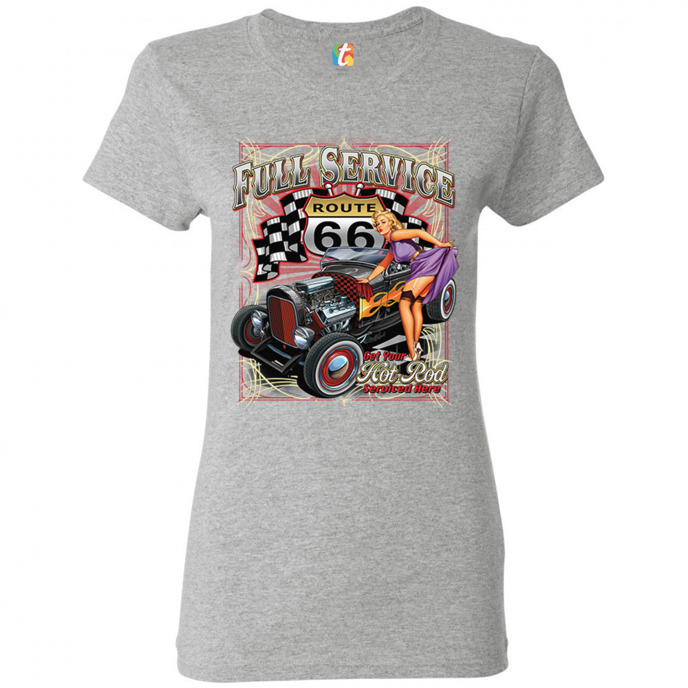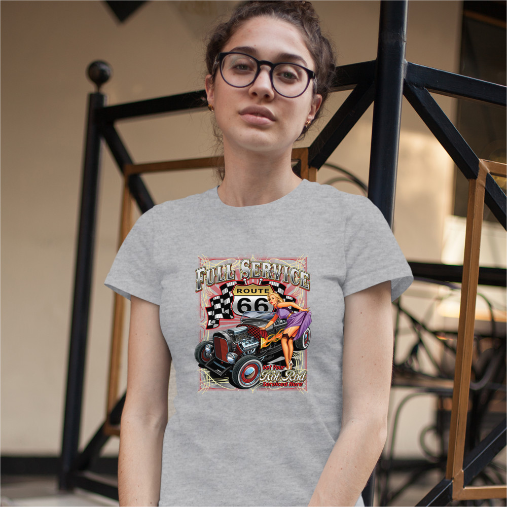 A print featuring a hot rod muscle car with flames painted on it's sides. There is a beautiful pin-up girl in stockings standing near it lifting her dress with one hand. The prints says: "full service" and "get your hot rod serviced here". In the background there is a Route 66 sign with racing flags to it's sides. Great for Route 66 and hot rod fans.