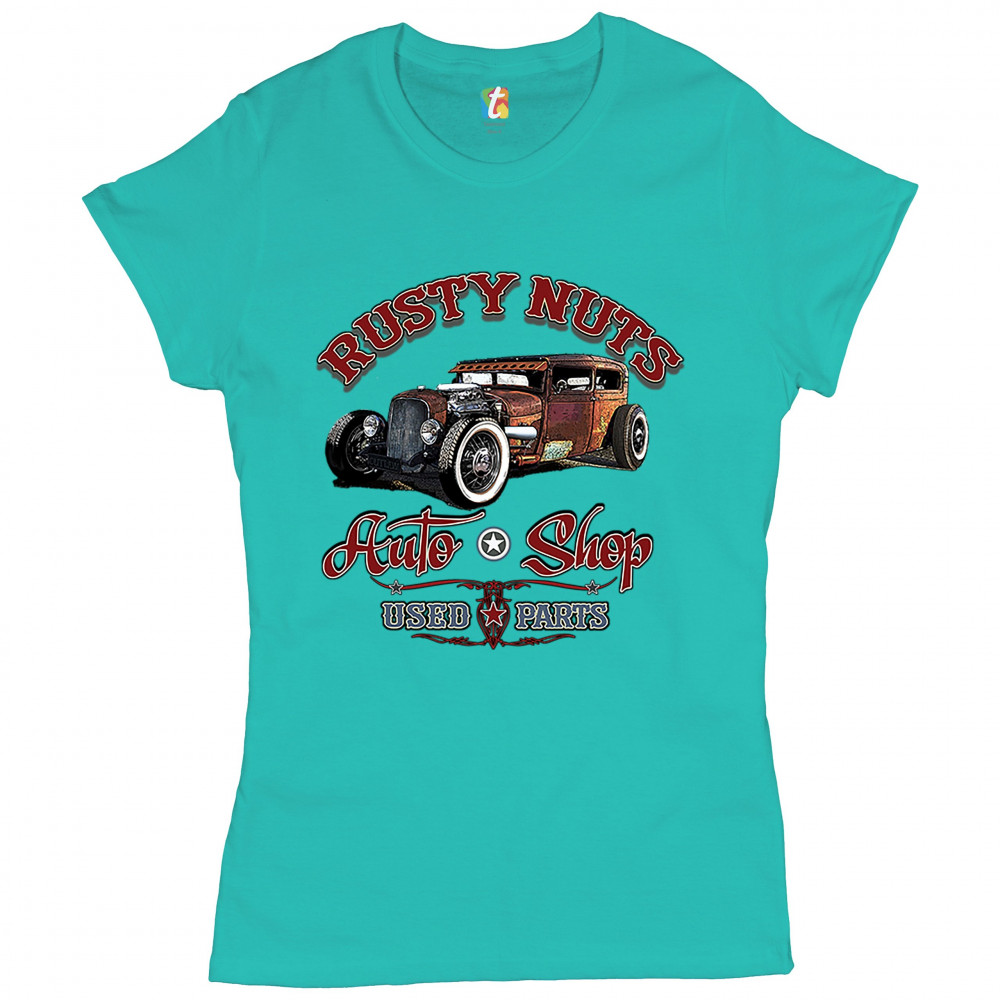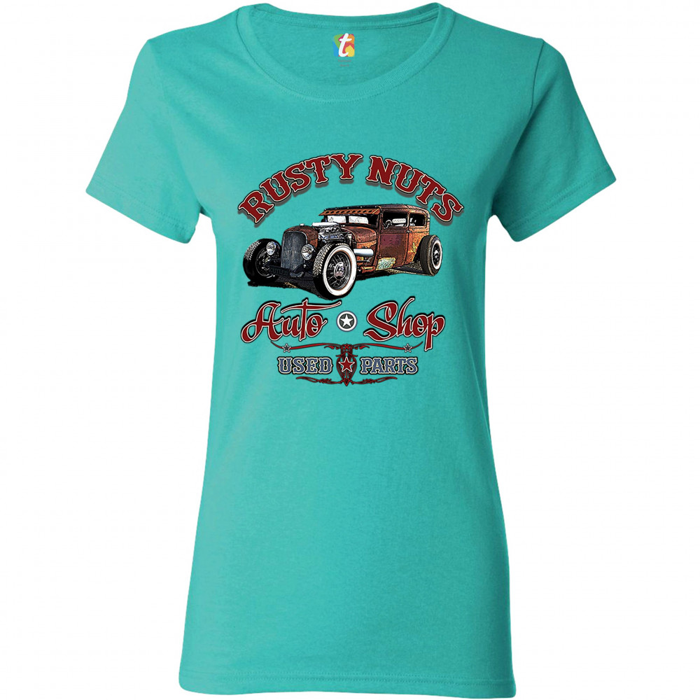 RUSTY NUTS AUTO SHOP t-shirt hot rod rat rod vintage old school women's tee light blue