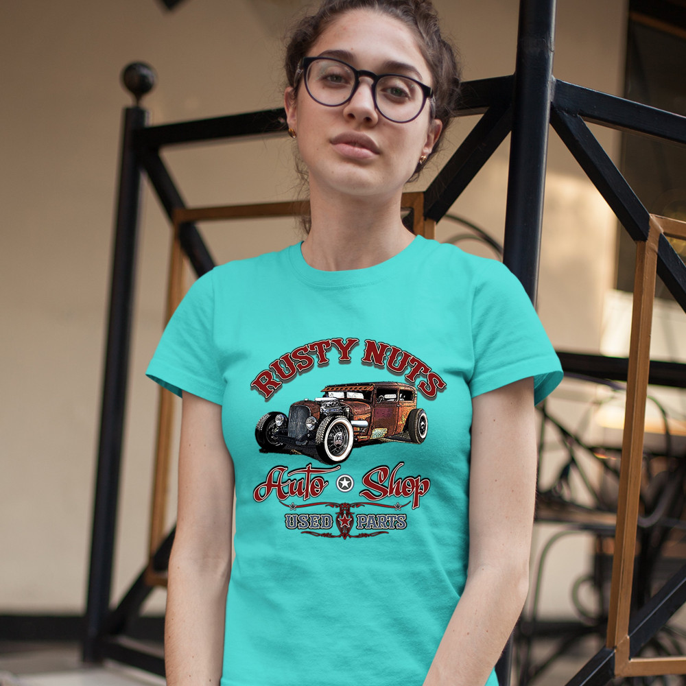 A print featuring a rat rod with an exposed engine. The print says: "Rusty Nuts, Auto Shop, Used Parts". A great choice for a fan of customized American classic cars and hot rods.