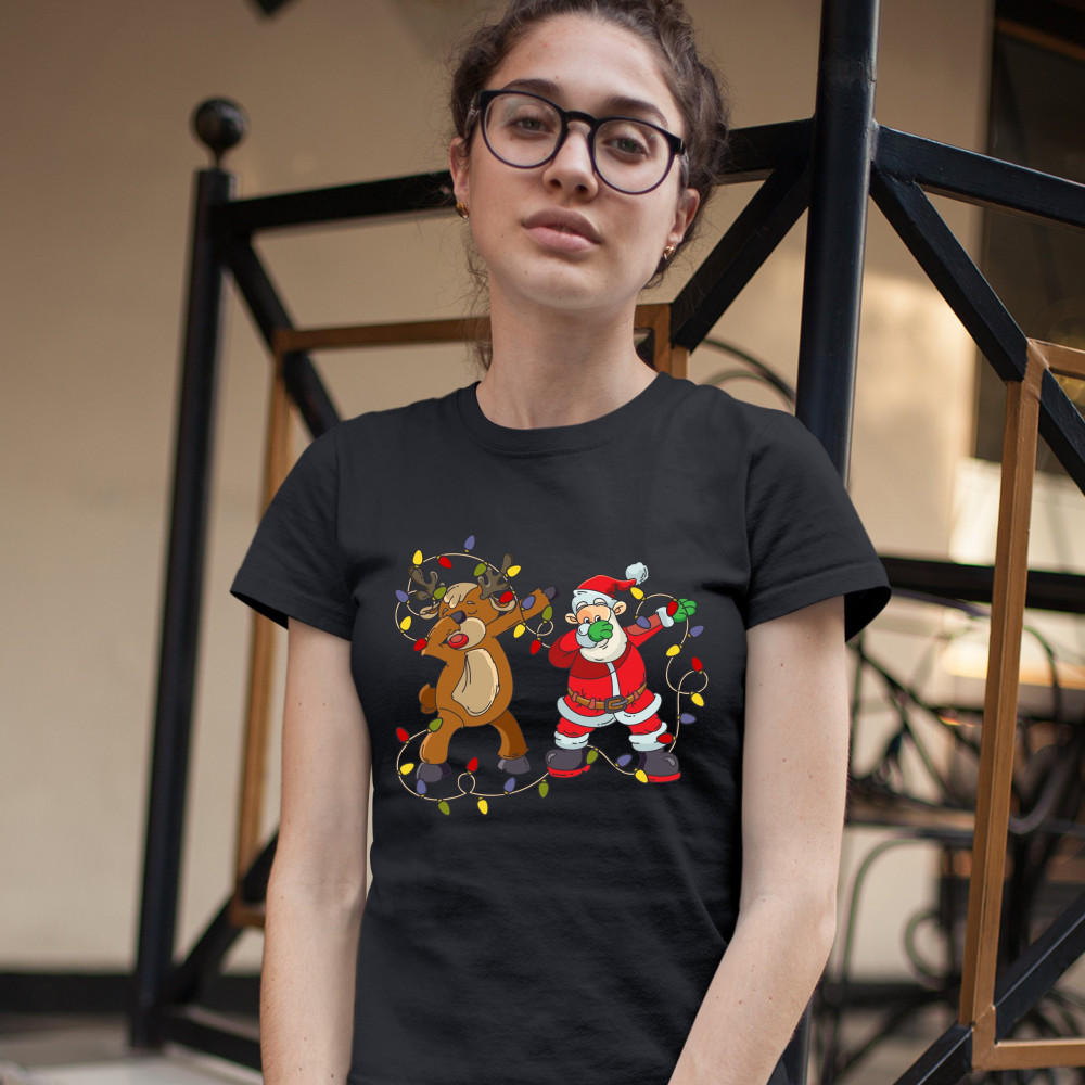 SANTA CLAUS AND RUDOLPH DAB DANCE t-shirt merry christmas xmas women's tee black