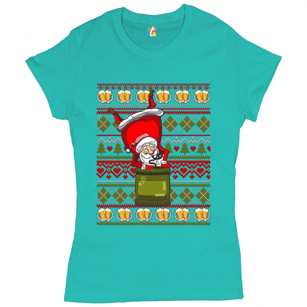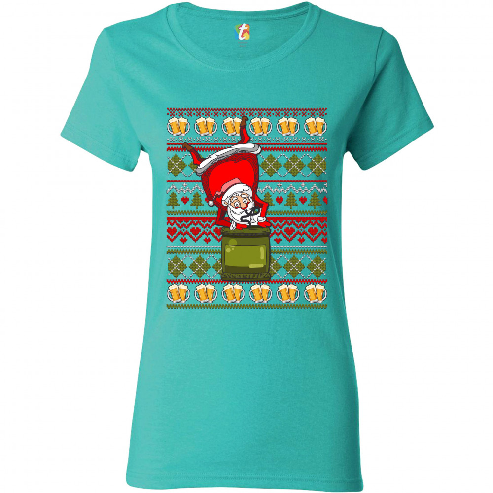 SANTA CLAUS KEG STAND t-shirt christmas ugly sweater beer drinking women's tee light blue