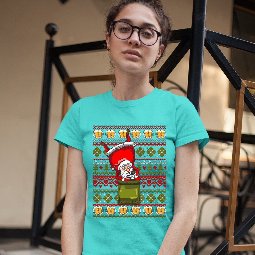 A funny print designed as an ugly sweater and featuring Santa Claus doing a keg stand. Amazing choice to make people smile and spread positive vibes on Christmas Eve.
