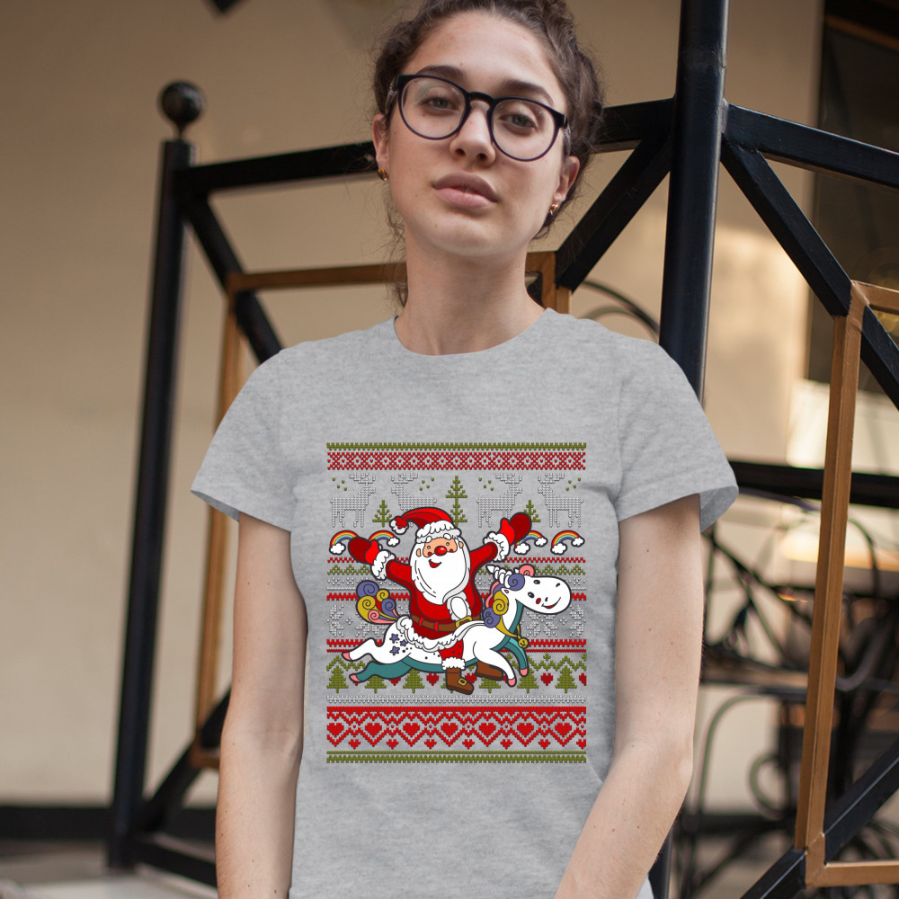 A funny print featuring a happy Santa Claus riding a unicorn and the ugly sweater pattern in the background. Amazing choice to make people smile and spread positive vibes on Christmas Eve.