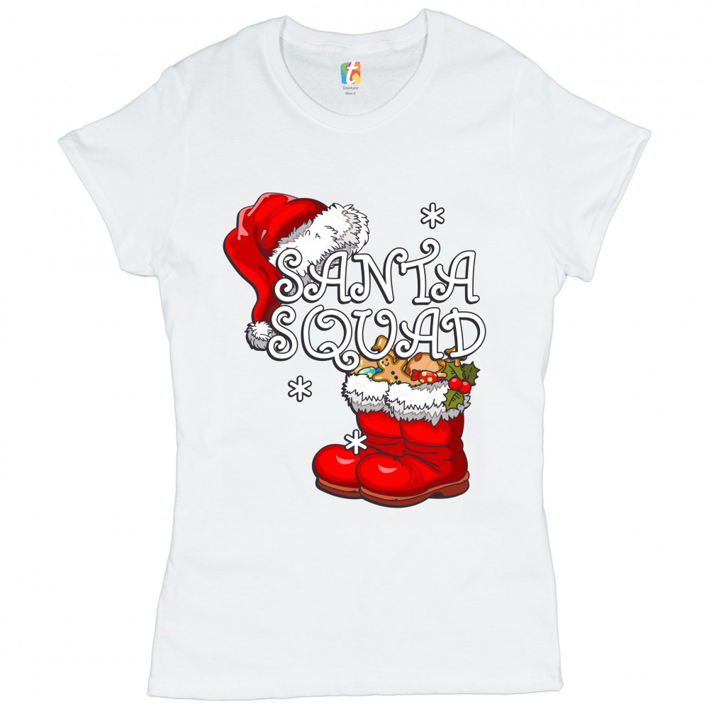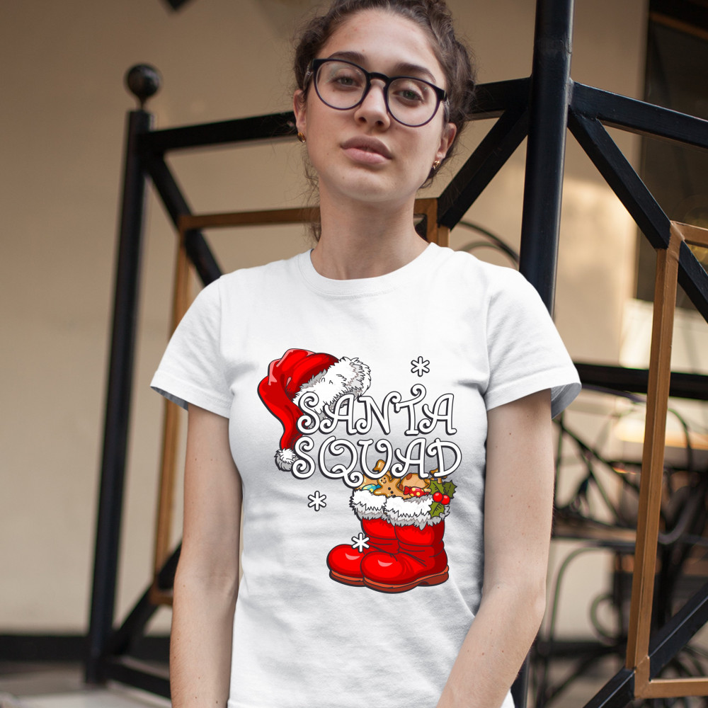 A funny print saying: "Santa Squad". The print features a pair of boots filled with candies, cookies and gingerbread men and Santa's hat. Amazing choice to make people smile and spread positive vibes on Christmas Eve.