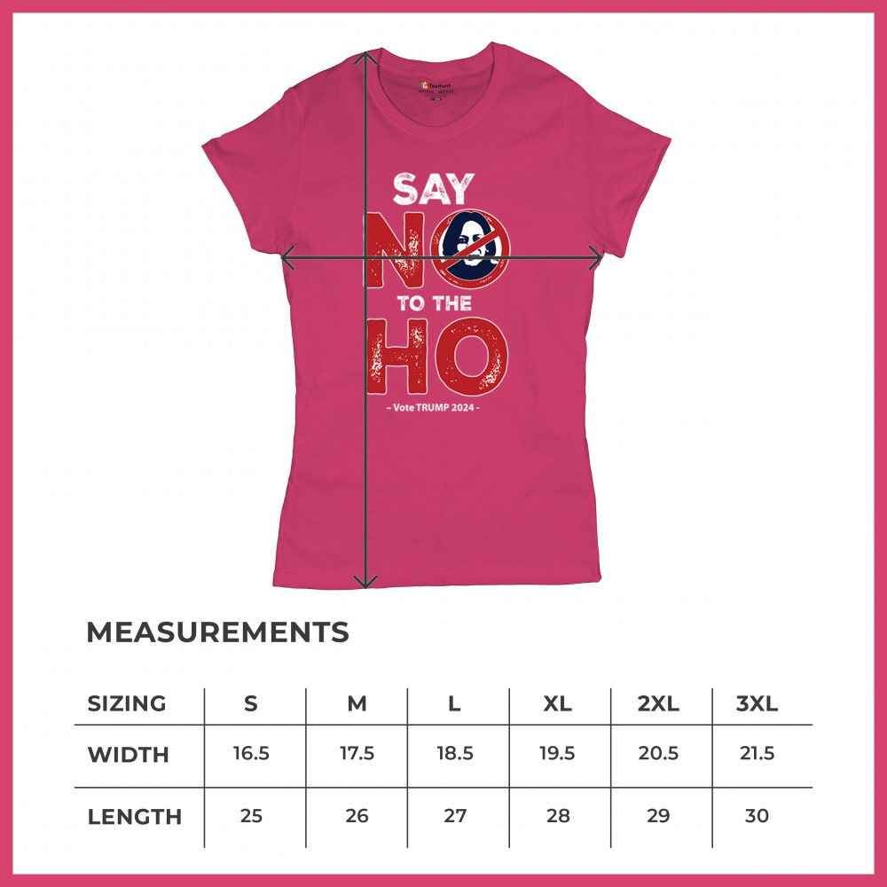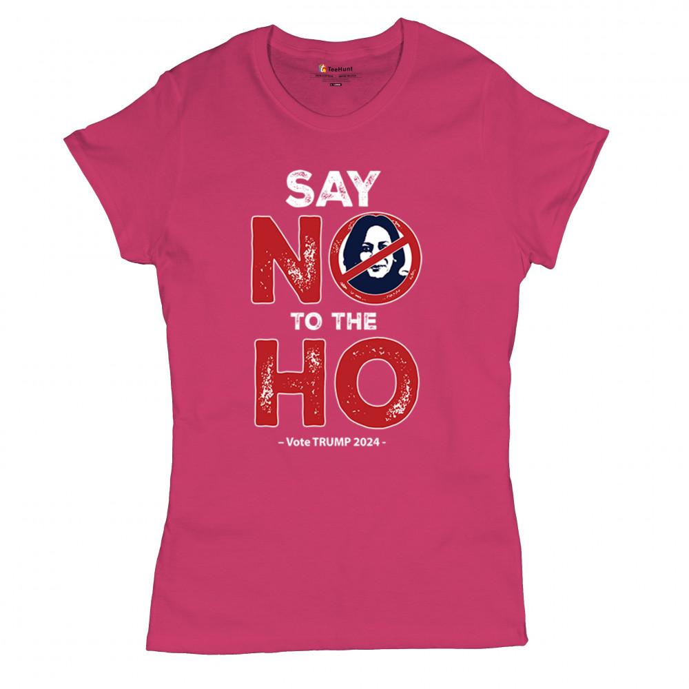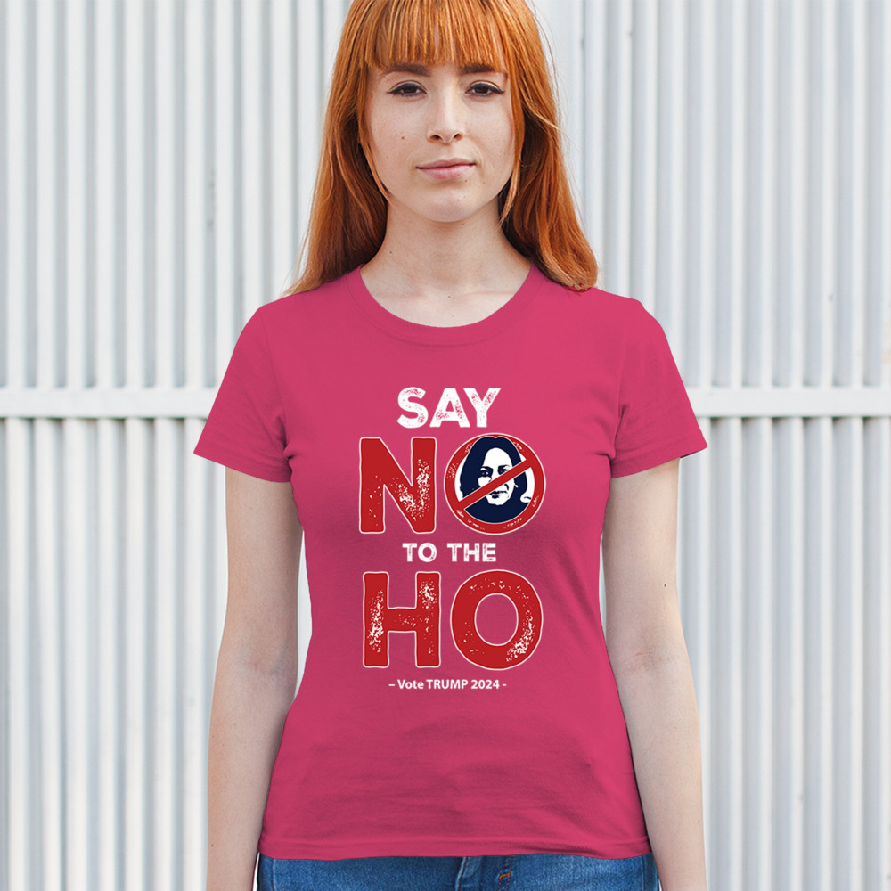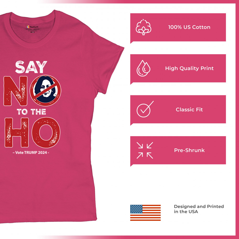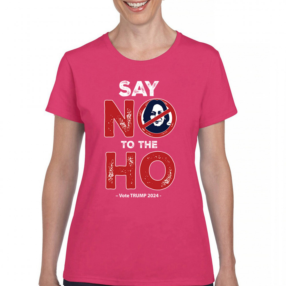 Show your conservative spirit with the "Say No to the Ho" print, perfect for rallies or daily wear. Support Trump-Vance 2024 and Make America Great Again.