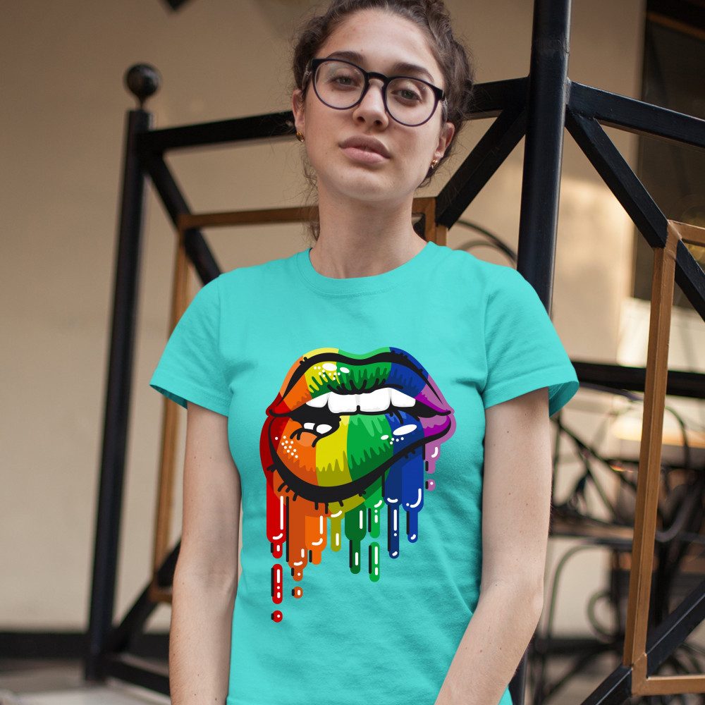 A print featuring sexy biting lips with rainbow lipstick on and rainbow liquid dripping off them. Great choice to wear as a proud queer person.