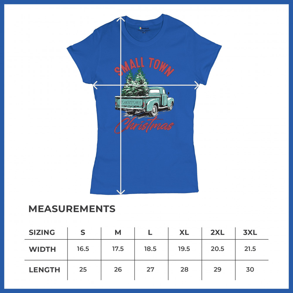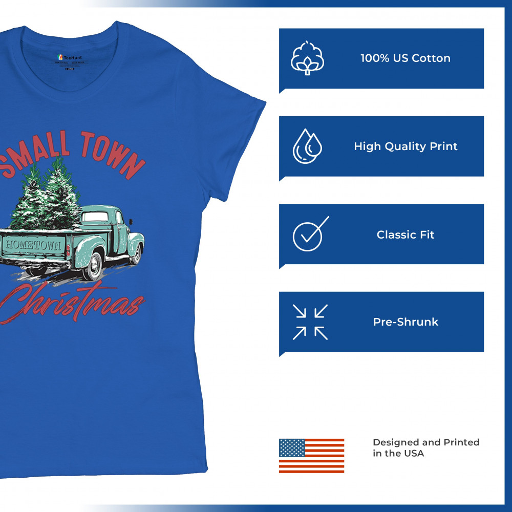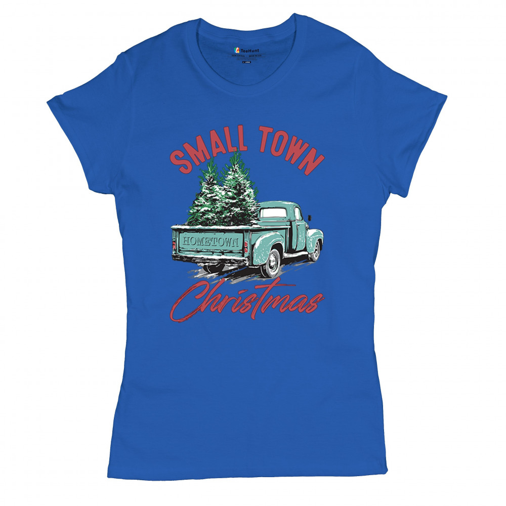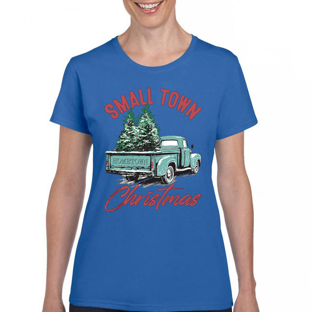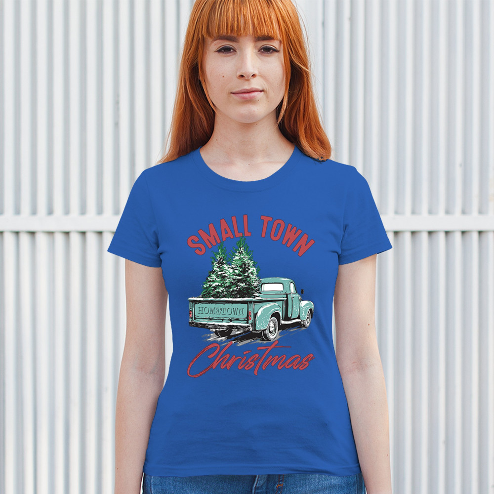 Embrace holiday nostalgia with this "Small Town Christmas" design featuring a vintage truck and Christmas trees. Perfect for rustic decor lovers.