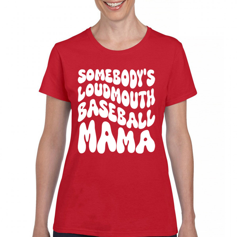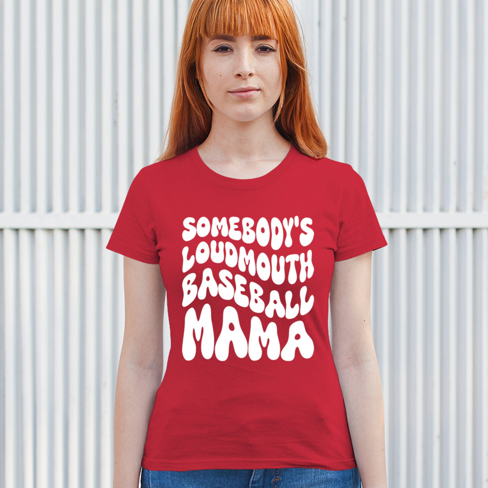 Show off your spirited support with the "Somebody's Loudmouth Baseball Mama" design. Perfect for game days, this bold and playful design captures your enthusiasm and pride.