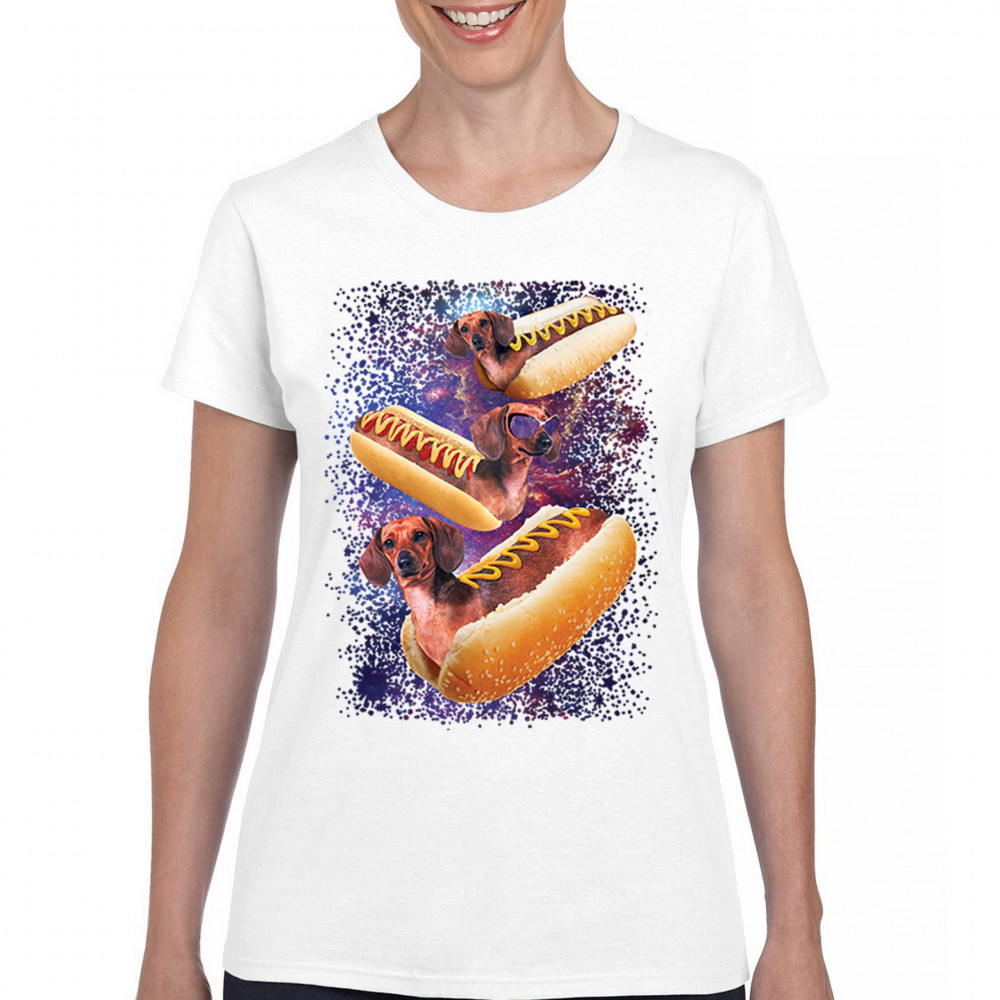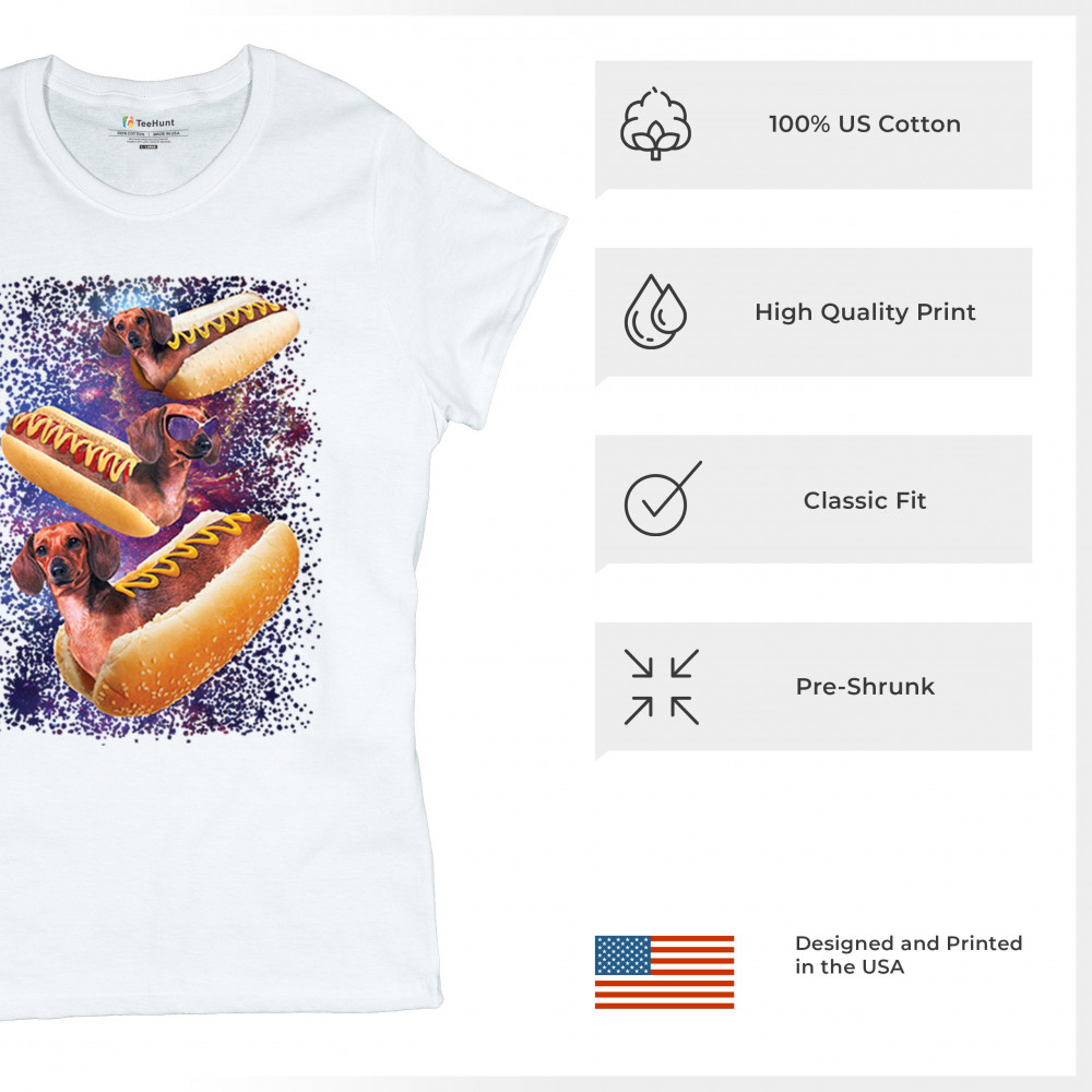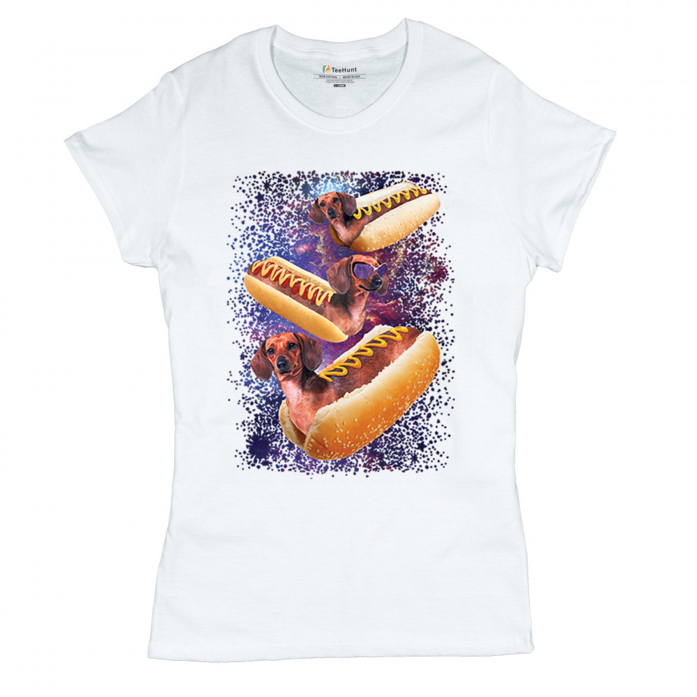 Quirky and fun tee featuring dachshunds as hotdogs in a cosmic setting. Perfect for dog and space lovers. Comfortable and durable.