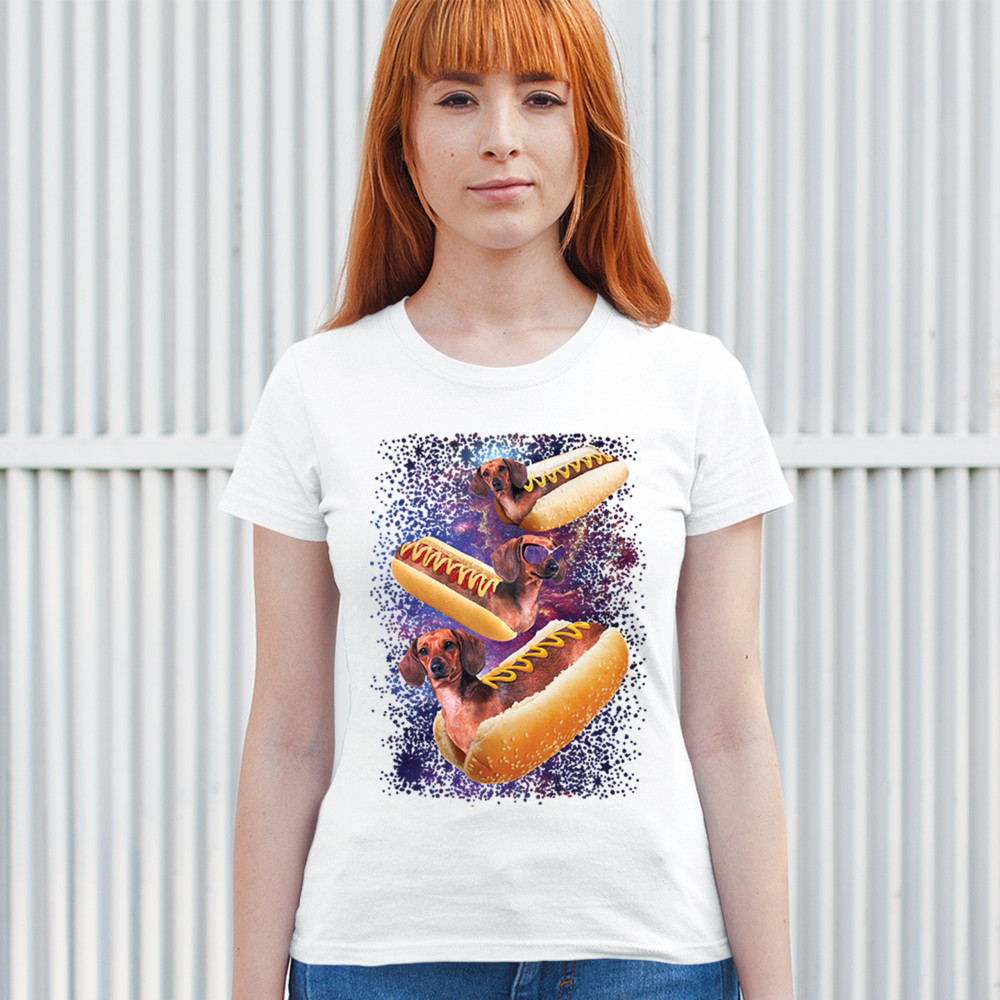 Add a dash of humor to your wardrobe with our unique design featuring adorable dachshunds as hotdogs in a cosmic setting. This playful graphic is perfect for animal lovers and those with a quirky sense of style. The vibrant colors and detailed illustration ensure you stand out in any crowd. Made from premium materials, this tee offers both comfort and durability, making it ideal for everyday wear or special occasions. Embrace your love for dogs and space with this fun and imaginative design.