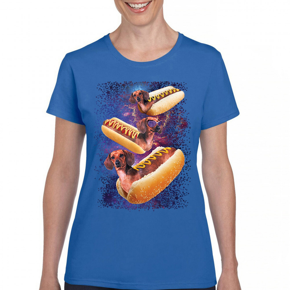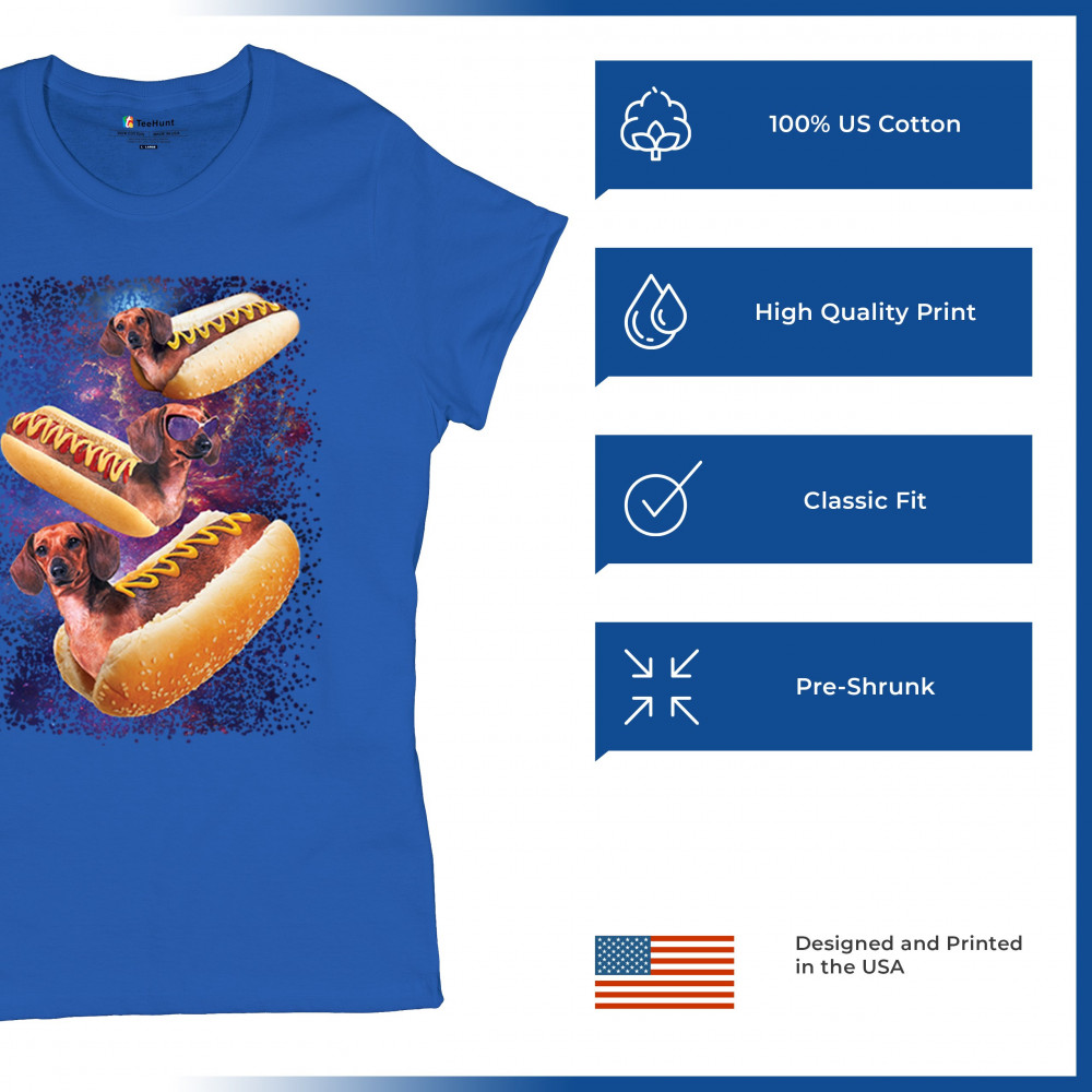 Quirky and fun tee featuring dachshunds as hotdogs in a cosmic setting. Perfect for dog and space lovers. Comfortable and durable.