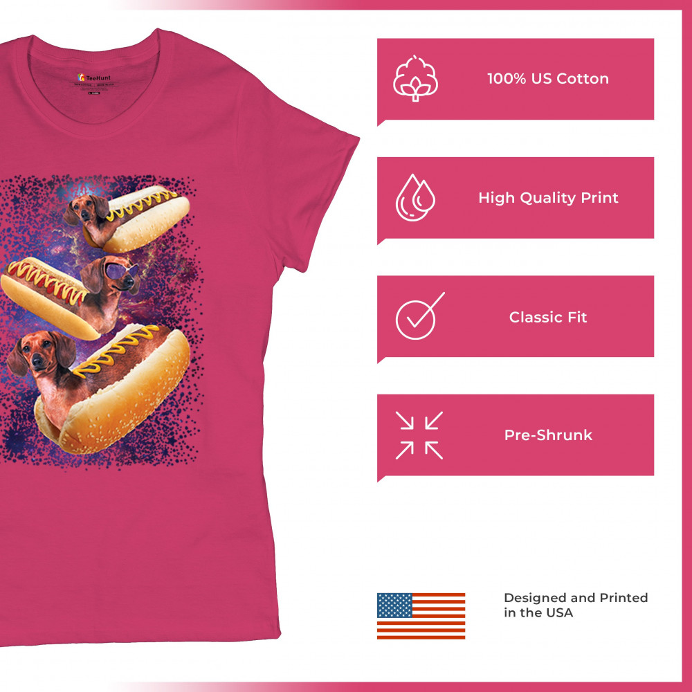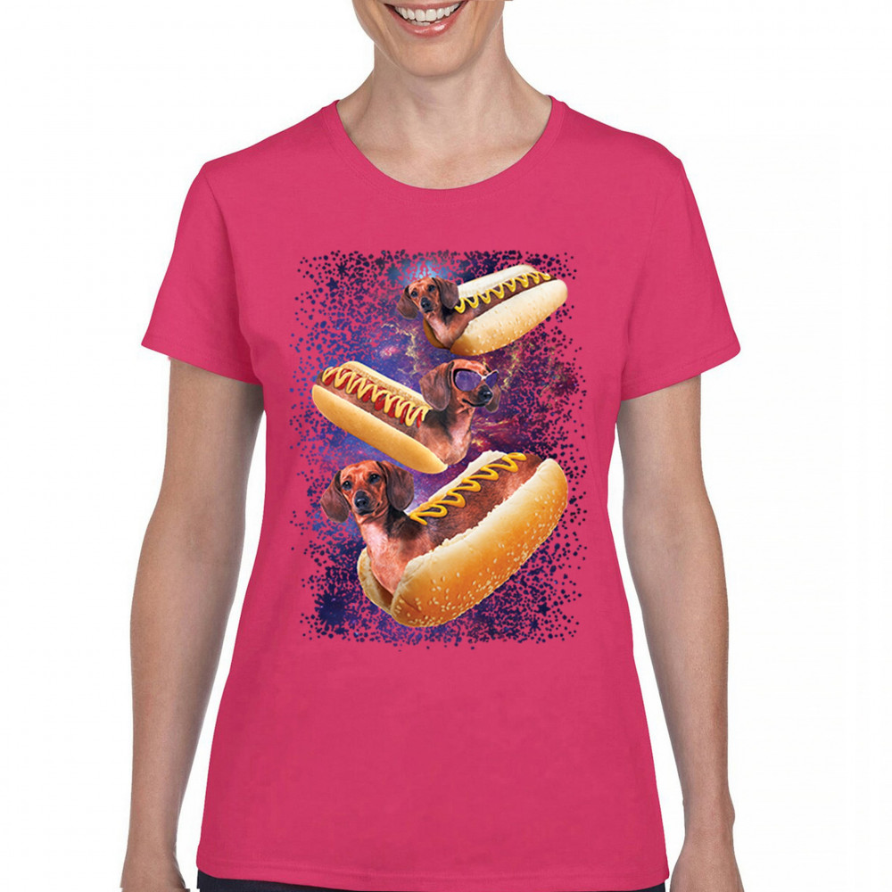 Quirky and fun tee featuring dachshunds as hotdogs in a cosmic setting. Perfect for dog and space lovers. Comfortable and durable.