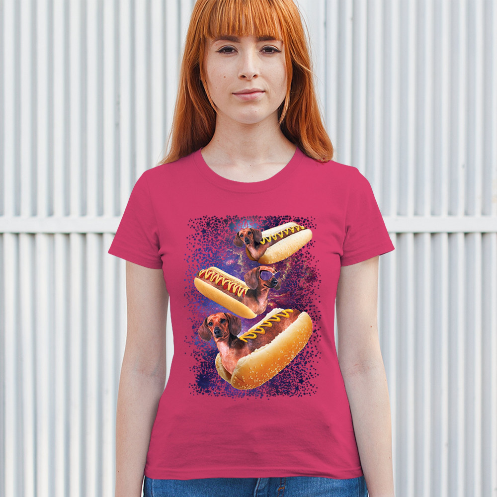 Add a dash of humor to your wardrobe with our unique design featuring adorable dachshunds as hotdogs in a cosmic setting. This playful graphic is perfect for animal lovers and those with a quirky sense of style. The vibrant colors and detailed illustration ensure you stand out in any crowd. Made from premium materials, this tee offers both comfort and durability, making it ideal for everyday wear or special occasions. Embrace your love for dogs and space with this fun and imaginative design.