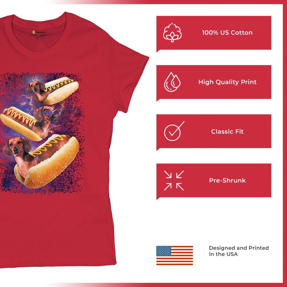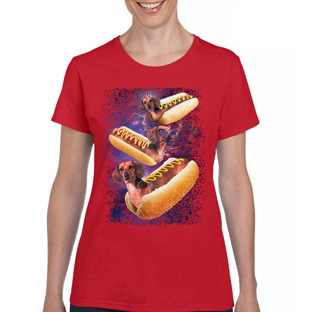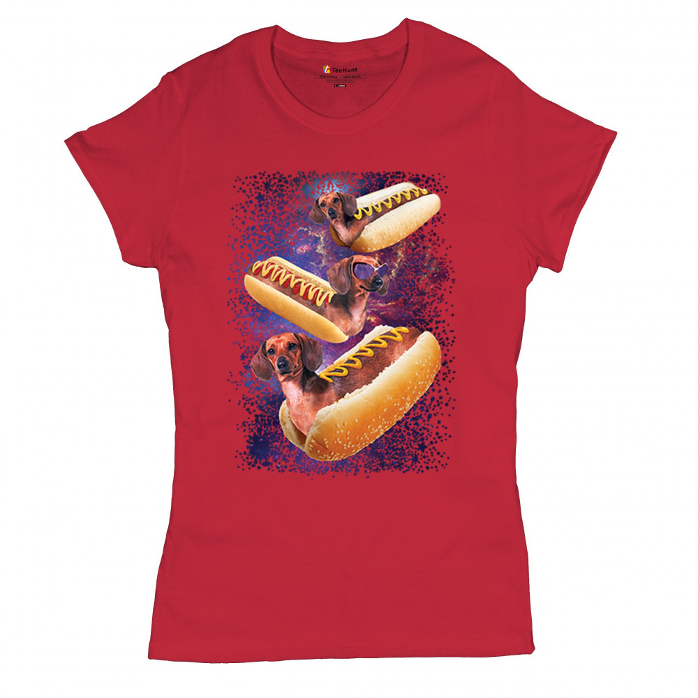 Quirky and fun tee featuring dachshunds as hotdogs in a cosmic setting. Perfect for dog and space lovers. Comfortable and durable.