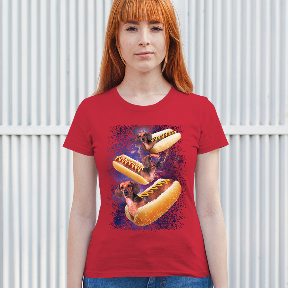 Add a dash of humor to your wardrobe with our unique design featuring adorable dachshunds as hotdogs in a cosmic setting. This playful graphic is perfect for animal lovers and those with a quirky sense of style. The vibrant colors and detailed illustration ensure you stand out in any crowd. Made from premium materials, this tee offers both comfort and durability, making it ideal for everyday wear or special occasions. Embrace your love for dogs and space with this fun and imaginative design.