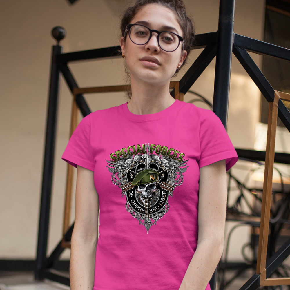A patriotic print featuring a skull wearing a green beret with a dagger in it's mouth. At the top the print says: "Special Forces". Around the skull there is a black stripe with the special forces' slogan written on it: "de oppresso liber". In the backgro