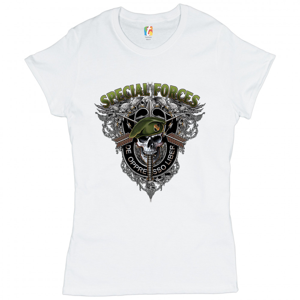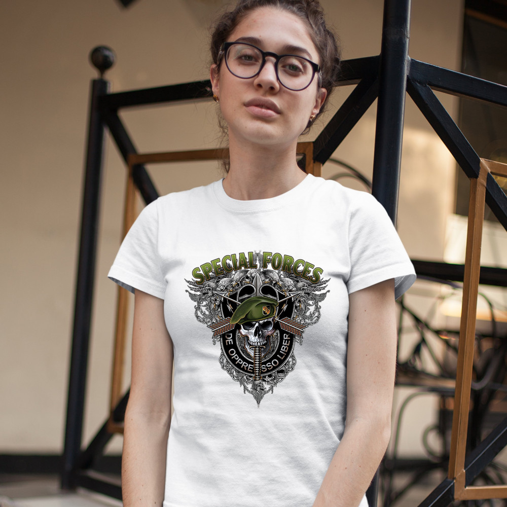 A patriotic print featuring a skull wearing a green beret with a dagger in it's mouth. At the top the print says: "Special Forces". Around the skull there is a black stripe with the special forces' slogan written on it: "de oppresso liber". In the backgro