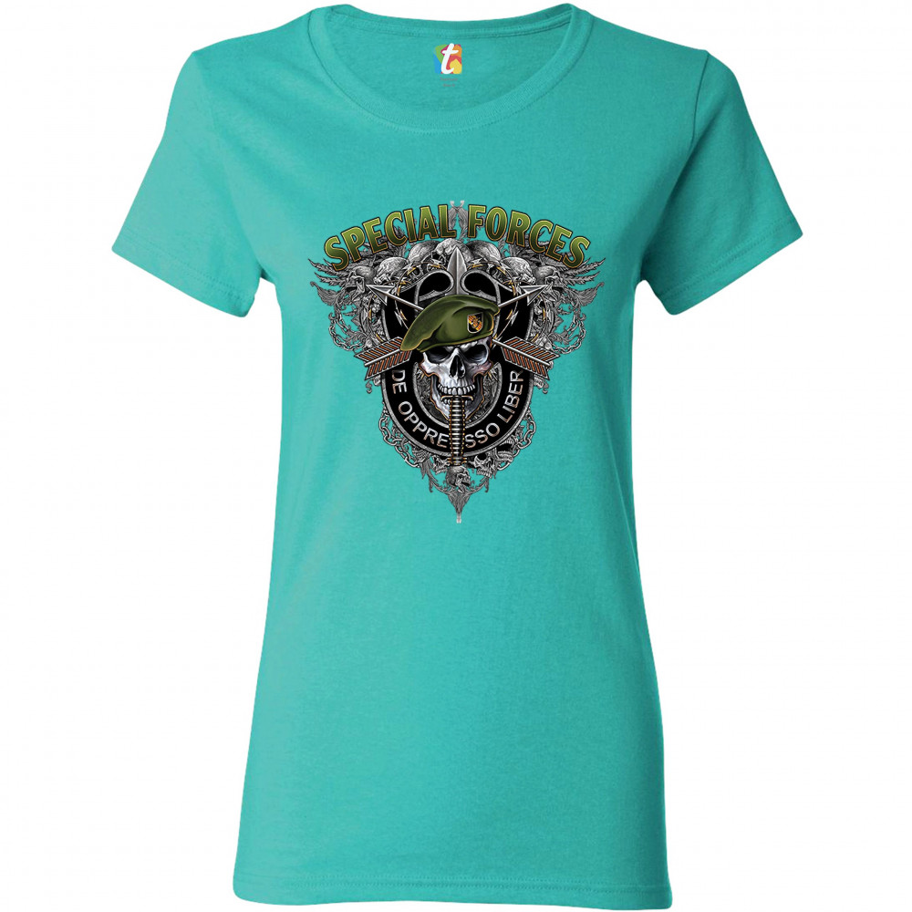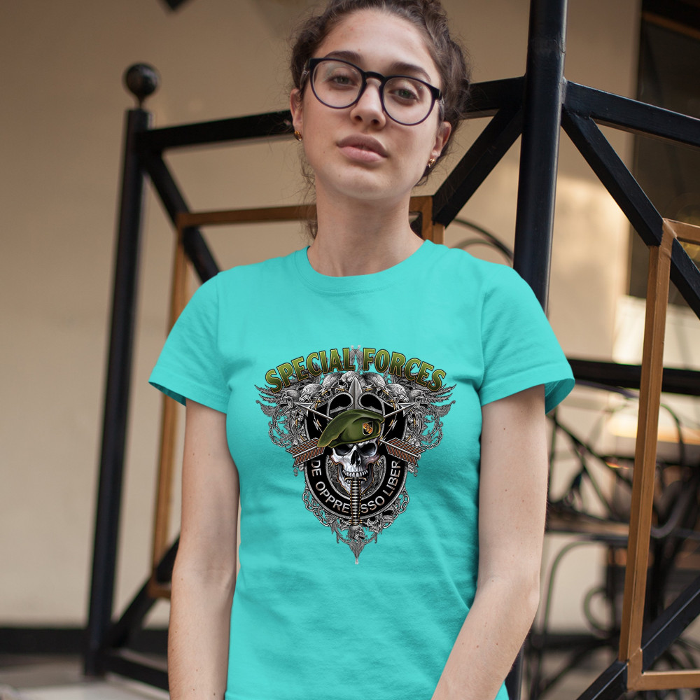 SPECIAL FORCES DE OPPRESSO LIBER t-shirt us military green berets women's tee light blue