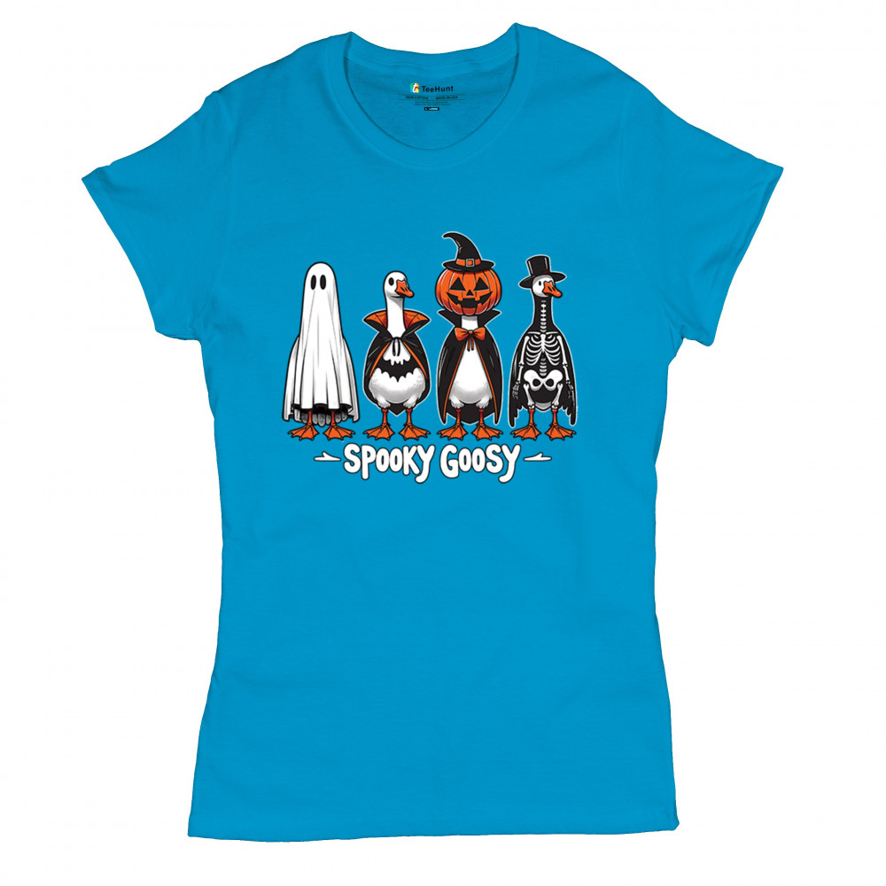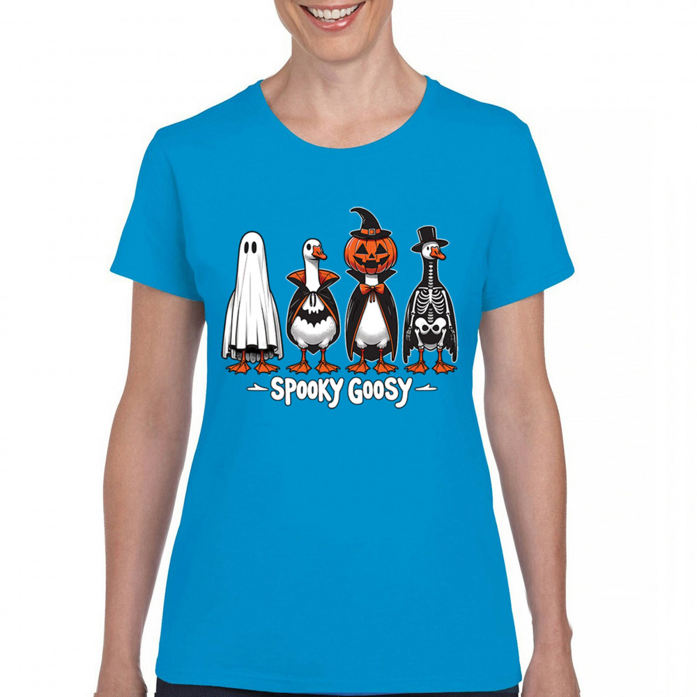 Spooky Goosy Halloween design with geese in witch, skeleton, vampire, and pumpkin costumes. Perfect for October 31, haunted house, and scary night fun.