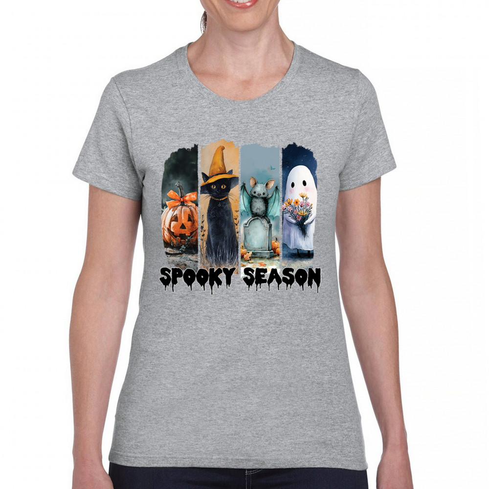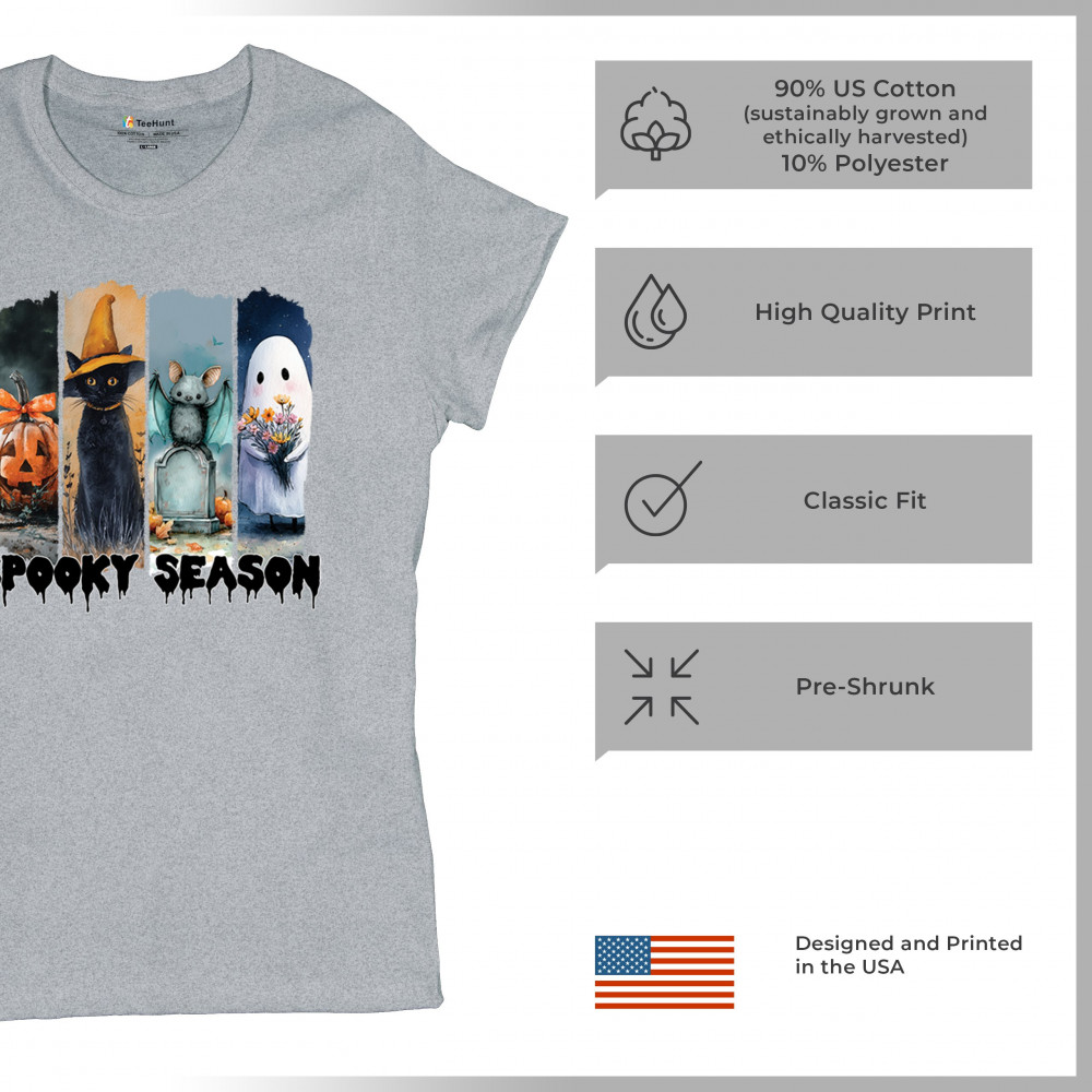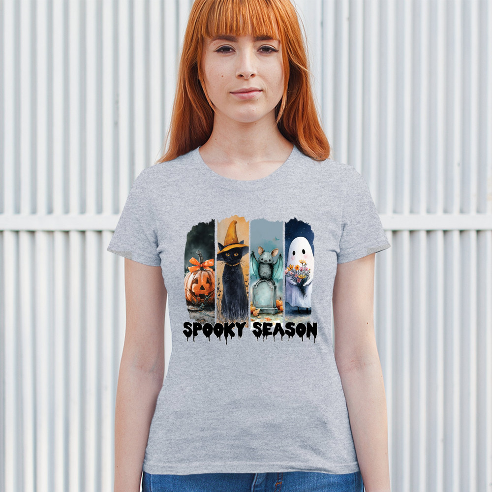 Spooky Season design with scary black cat, jack o lantern, haunted ghost house, and cute ghost. Perfect for October 31, trick or treat, and fall fun.
