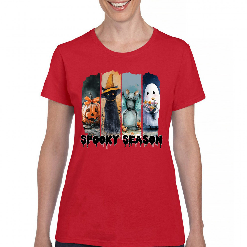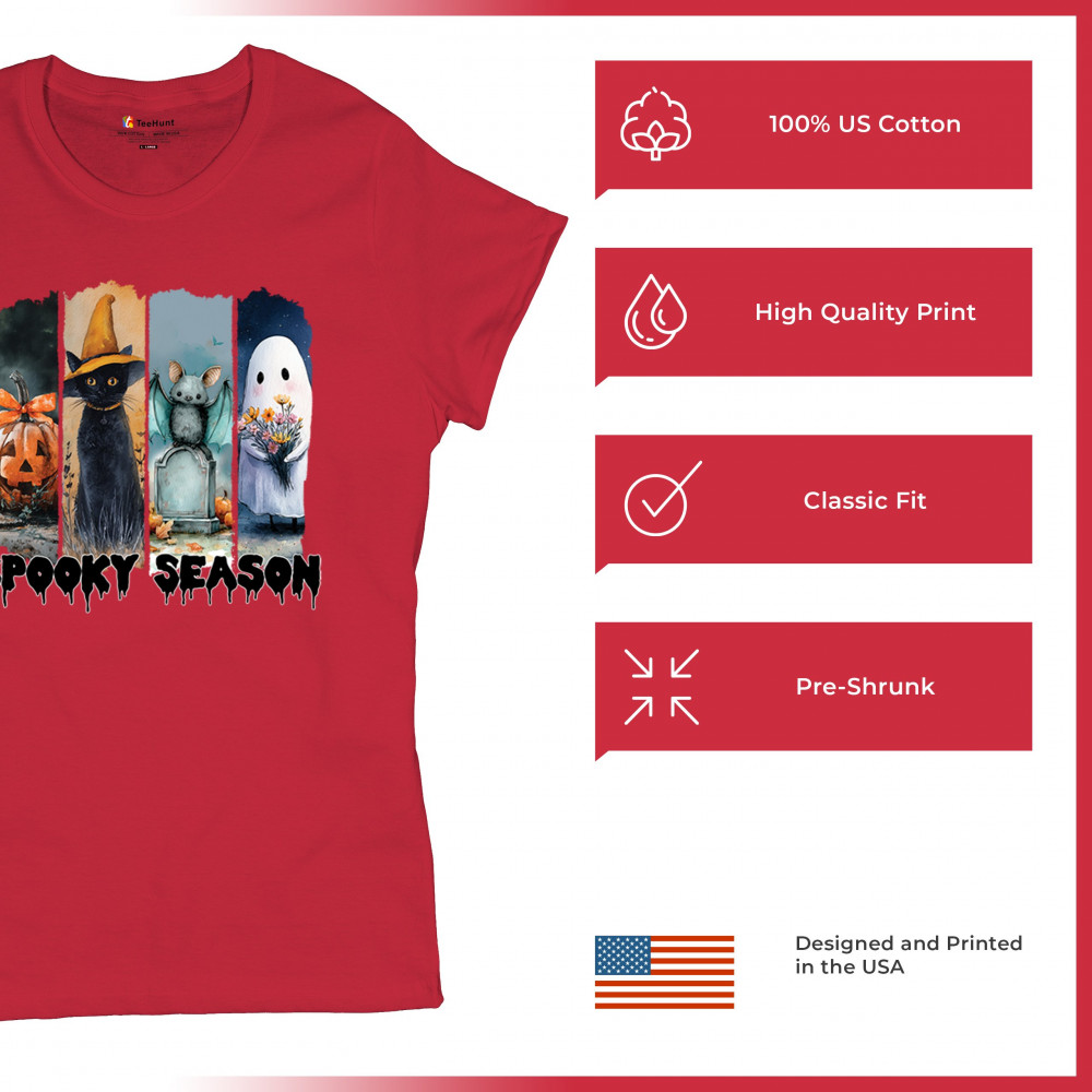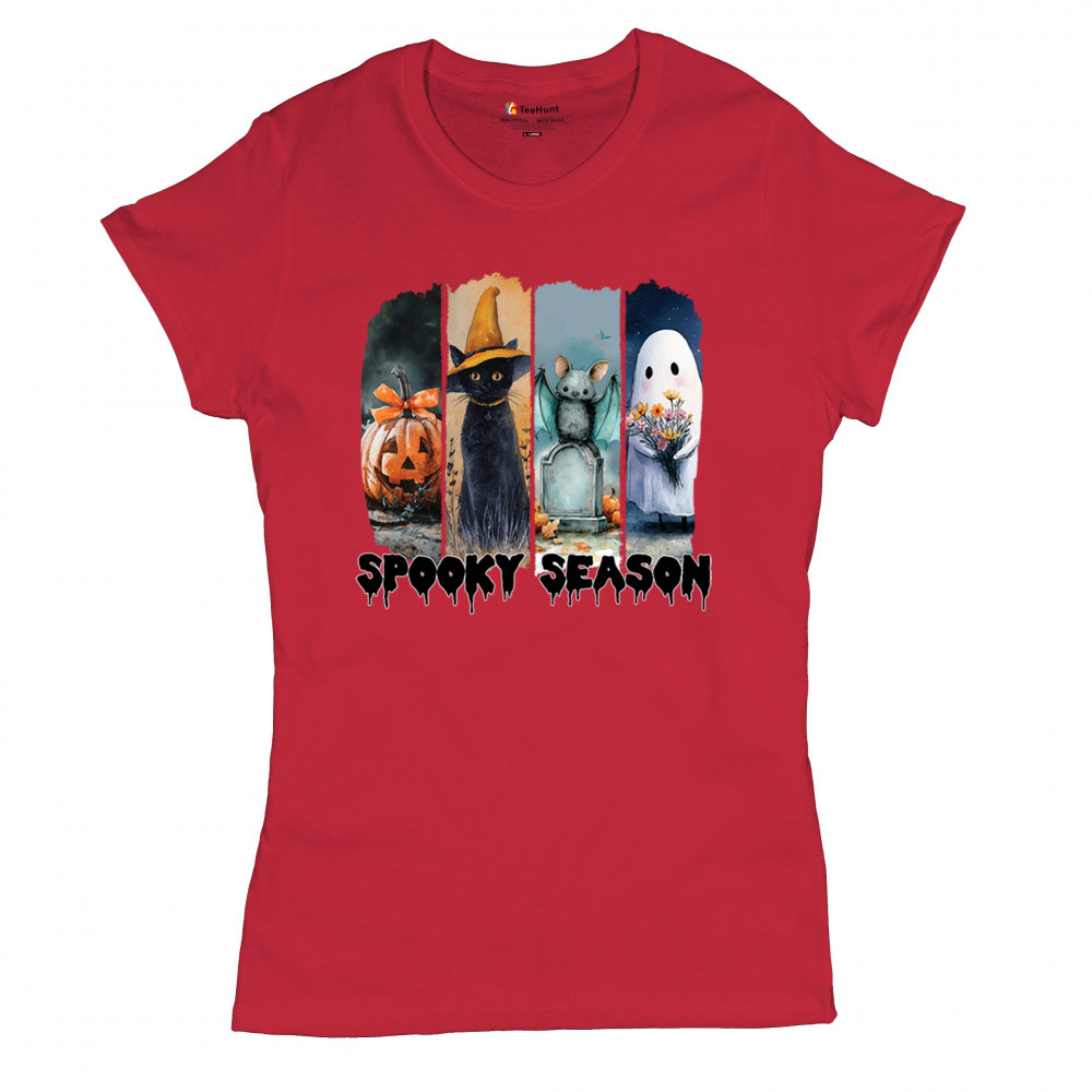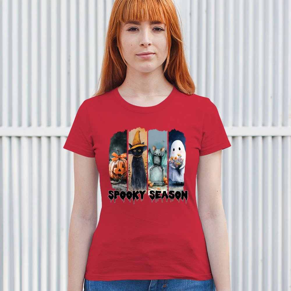 Spooky Season design with scary black cat, jack o lantern, haunted ghost house, and cute ghost. Perfect for October 31, trick or treat, and fall fun.