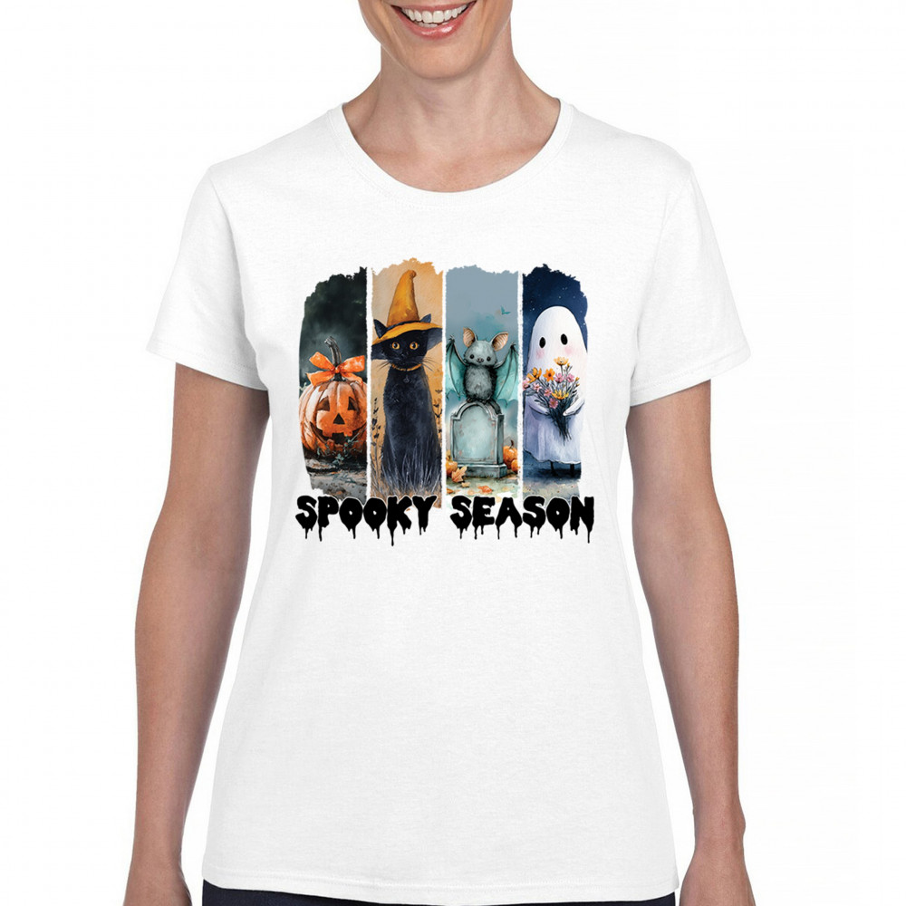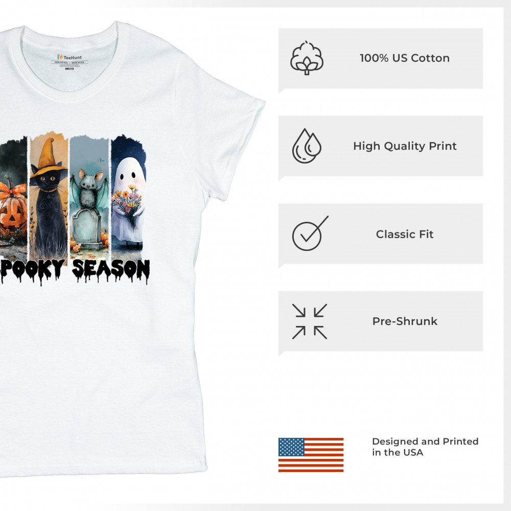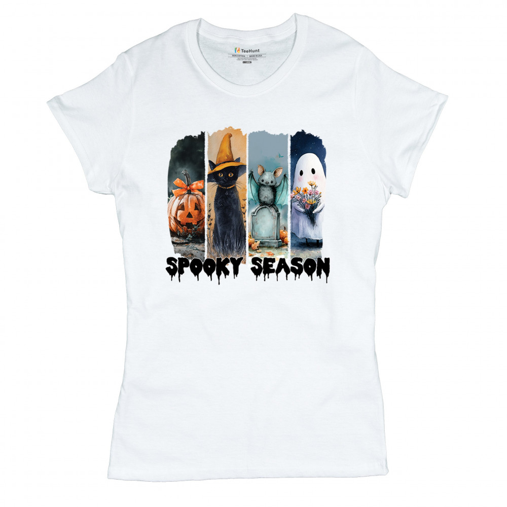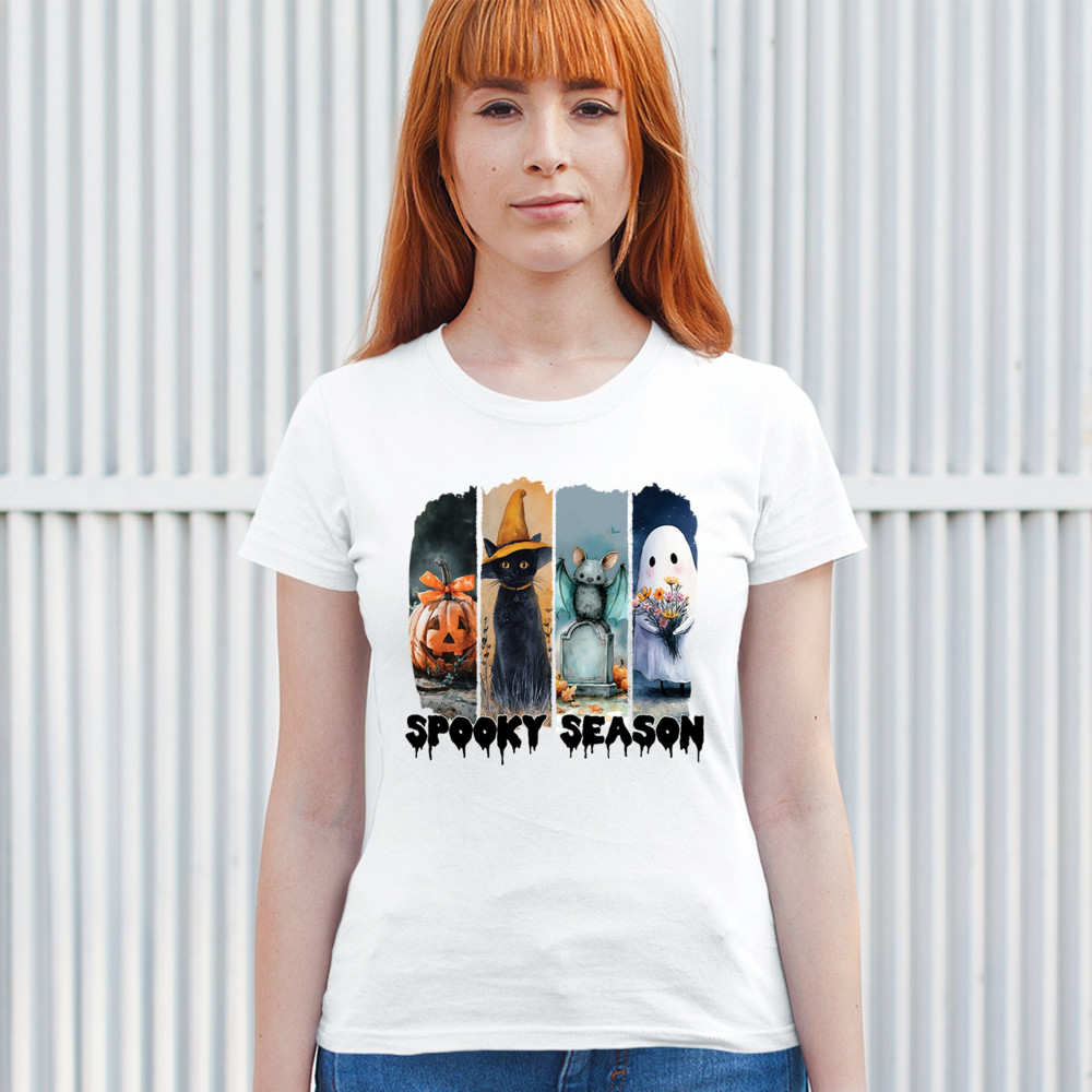 Spooky Season design with scary black cat, jack o lantern, haunted ghost house, and cute ghost. Perfect for October 31, trick or treat, and fall fun.