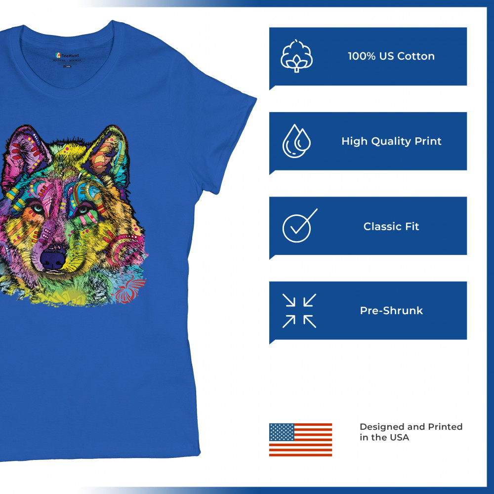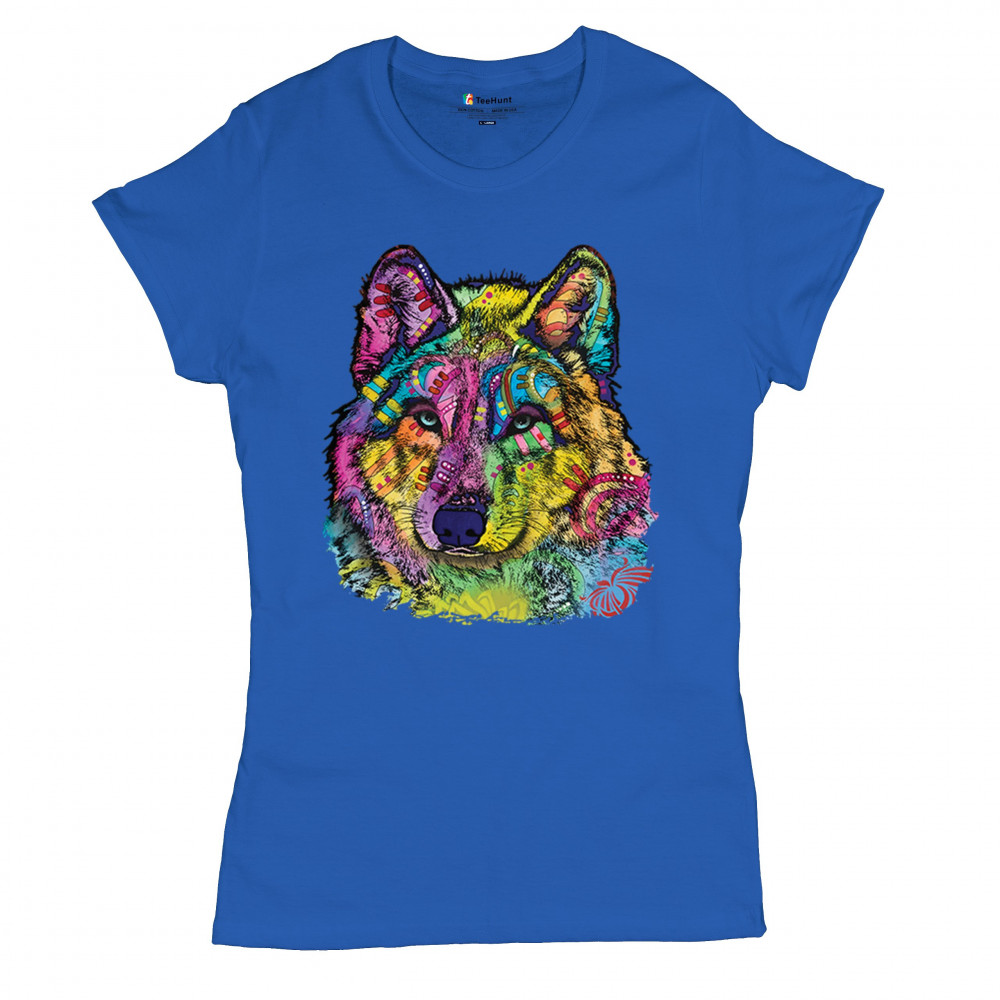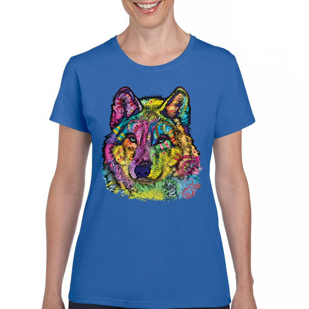 STARE OF THE WOLF t-shirt dean russo colorful neon animal art women's tee royal blue
