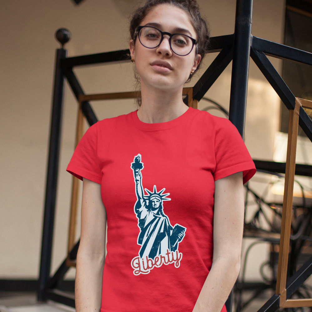 A patriotic print featuring the Statue of Liberty with the word "Liberty" written below it. Great choice to wear on Independence Day or any other patriotic holiday.