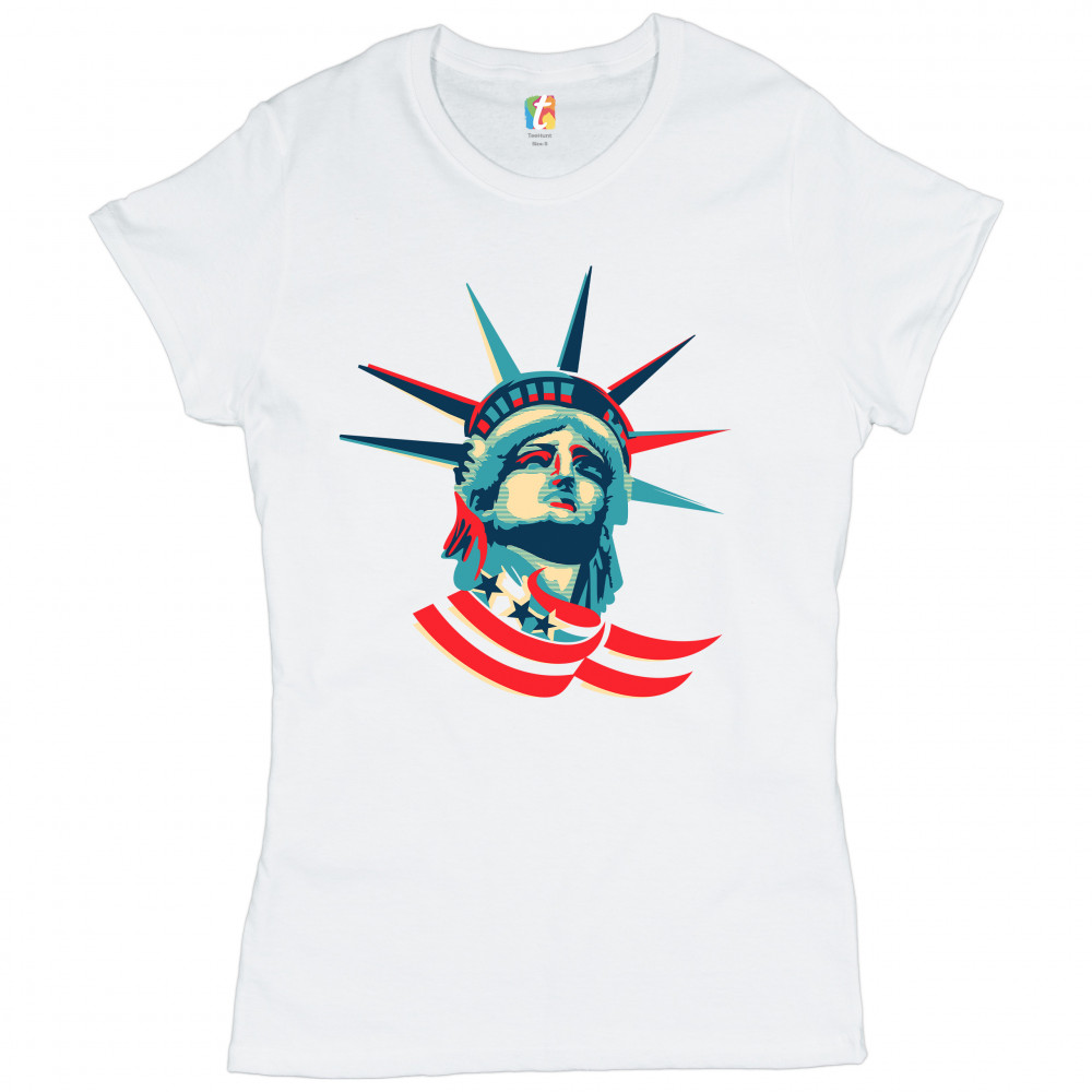 A patriotic print featuring a dripping silhouette of a bald eagle. The body is painted blue with lots of stars on it and the feathers of the wings, painted red, resemble the stripes of the American Flag. Over the wings there is a text written: "Land of the free home of the brave". Great choice to wear on Independence Day or any other patriotic holiday.