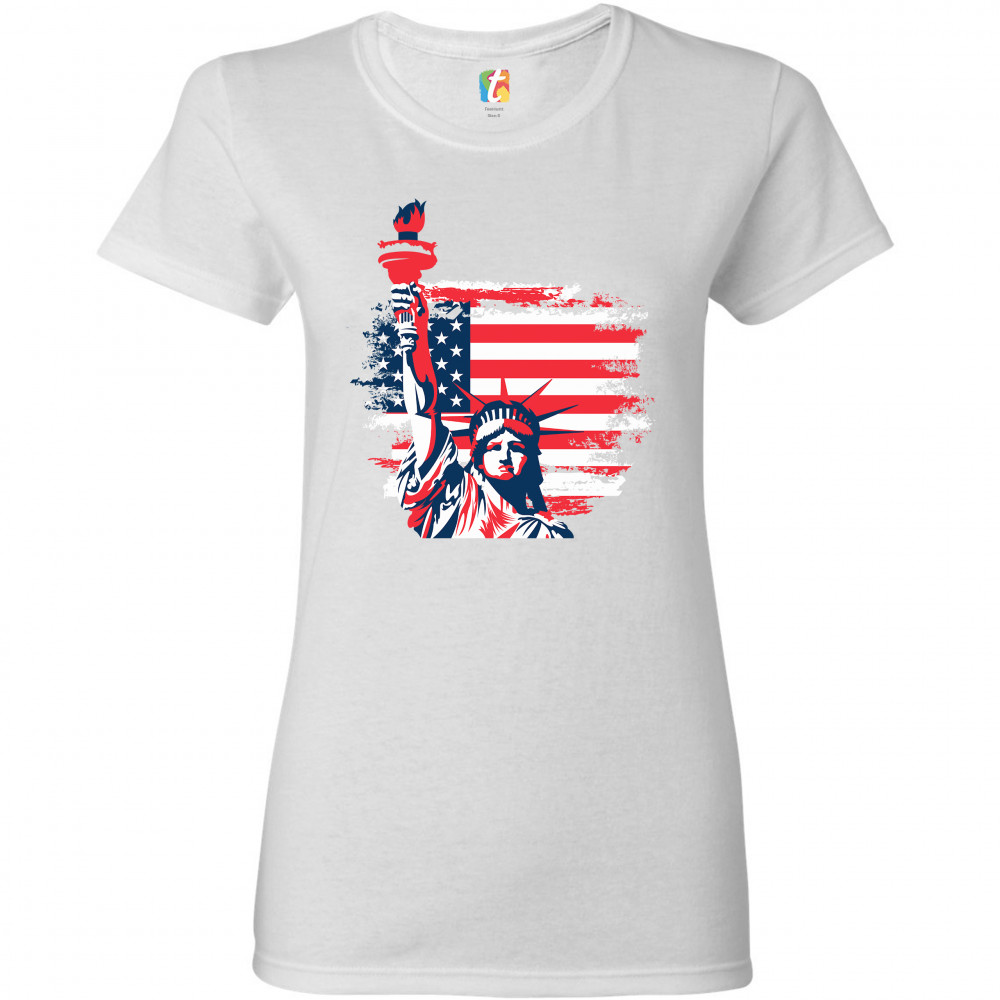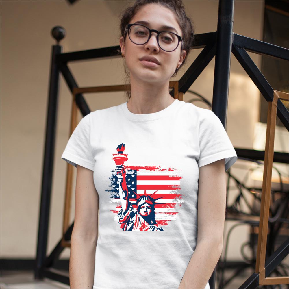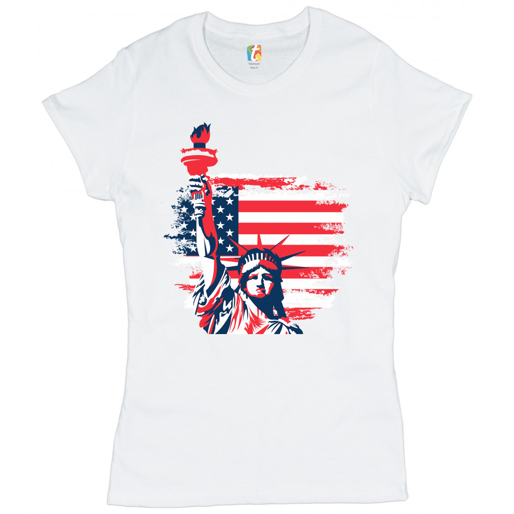 A patriotic print featuring a dripping silhouette of a bald eagle. The body is painted blue with lots of stars on it and the feathers of the wings, painted red, resemble the stripes of the American Flag. Over the wings there is a text written: "Land of the free home of the brave". Great choice to wear on Independence Day or any other patriotic holiday.