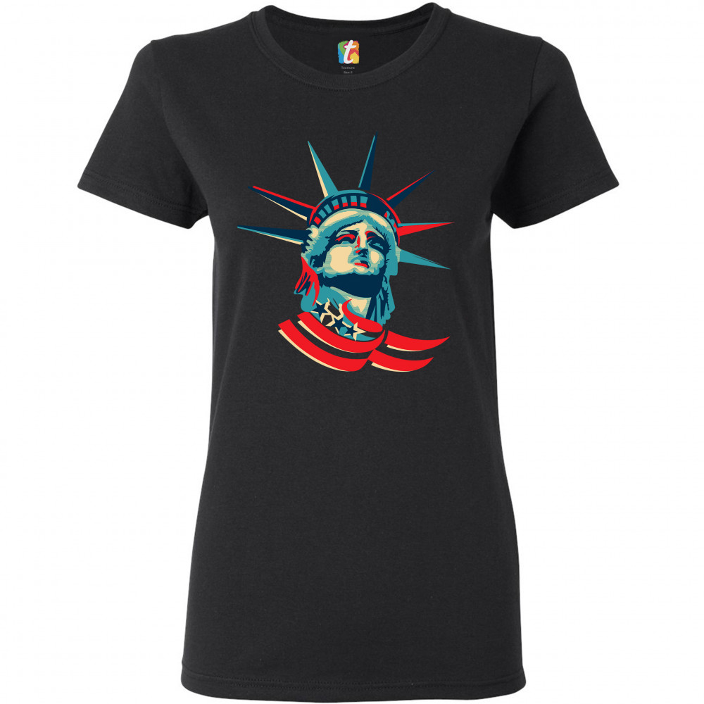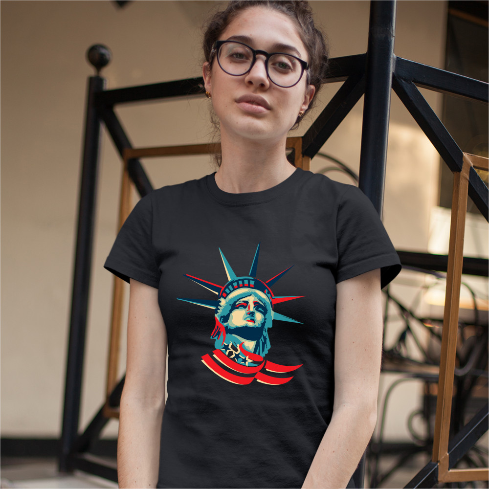 A patriotic print featuring a dripping silhouette of a bald eagle. The body is painted blue with lots of stars on it and the feathers of the wings, painted red, resemble the stripes of the American Flag. Over the wings there is a text written: "Land of the free home of the brave". Great choice to wear on Independence Day or any other patriotic holiday.