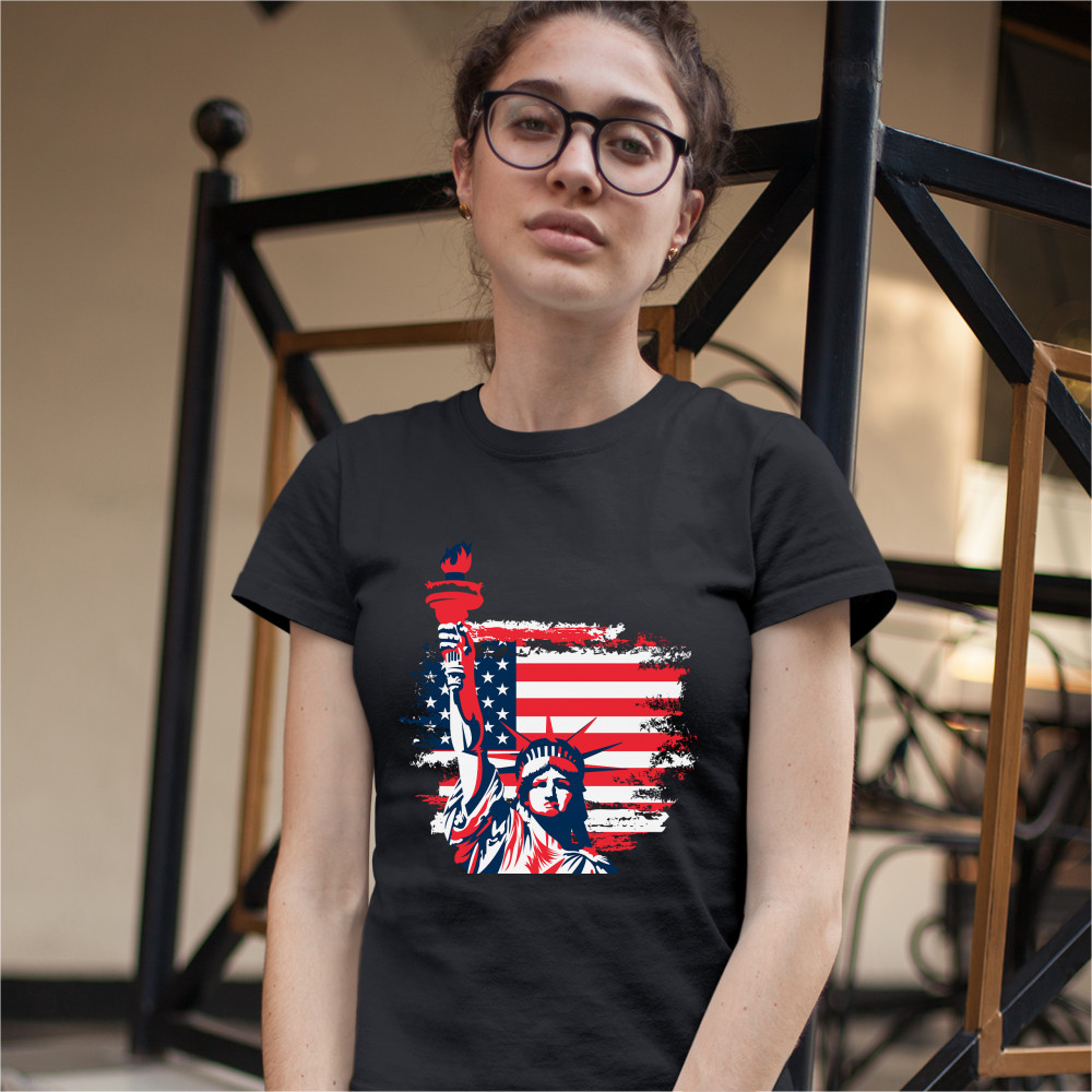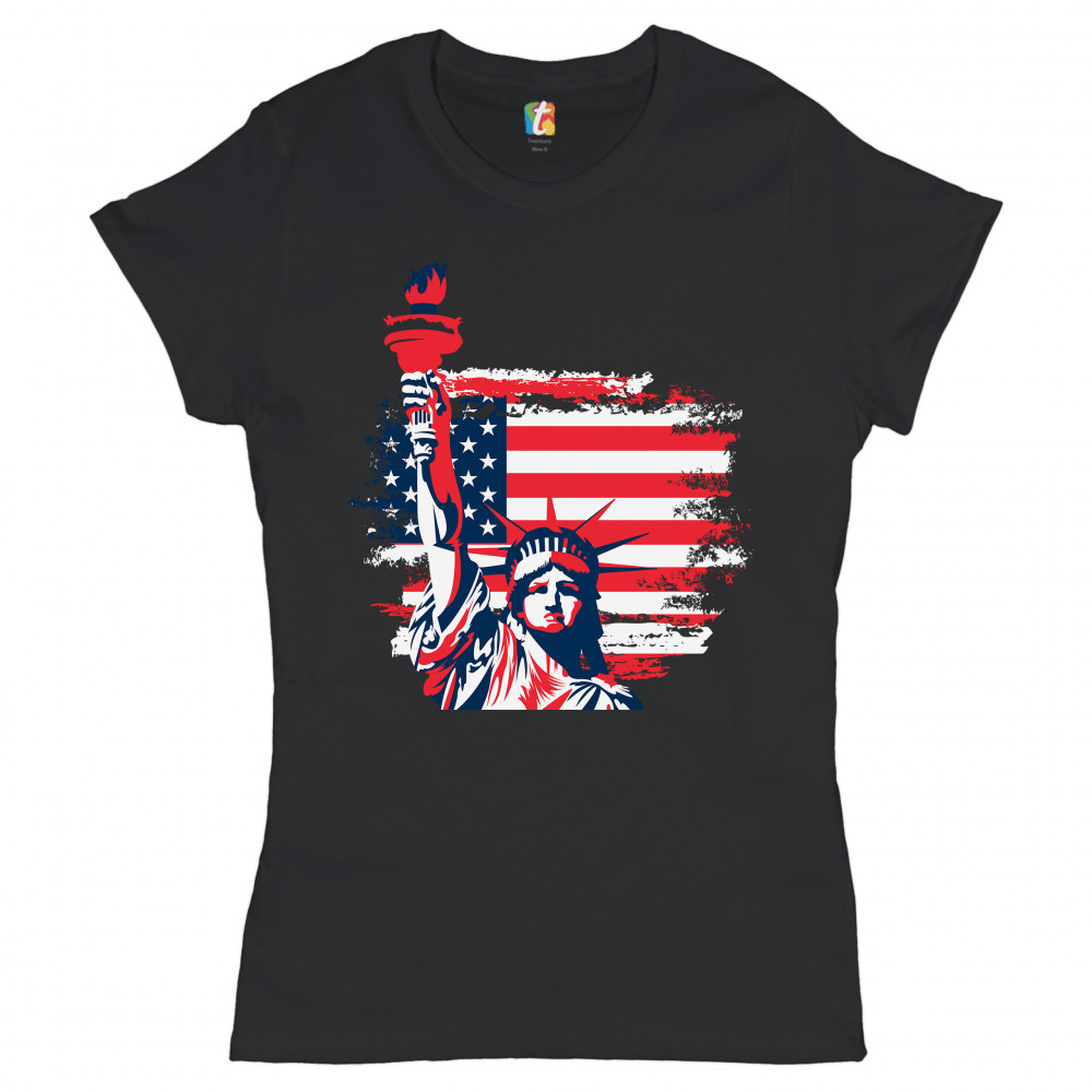 A patriotic print featuring a dripping silhouette of a bald eagle. The body is painted blue with lots of stars on it and the feathers of the wings, painted red, resemble the stripes of the American Flag. Over the wings there is a text written: "Land of the free home of the brave". Great choice to wear on Independence Day or any other patriotic holiday.