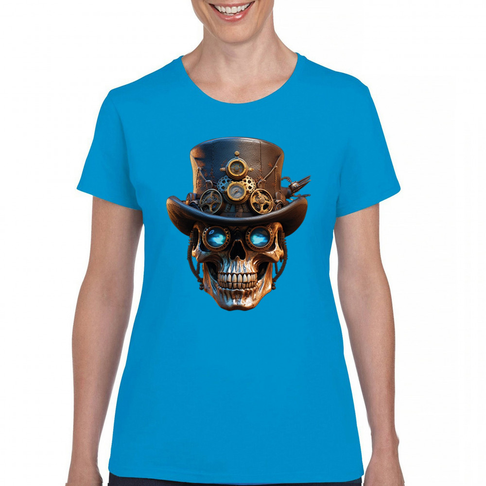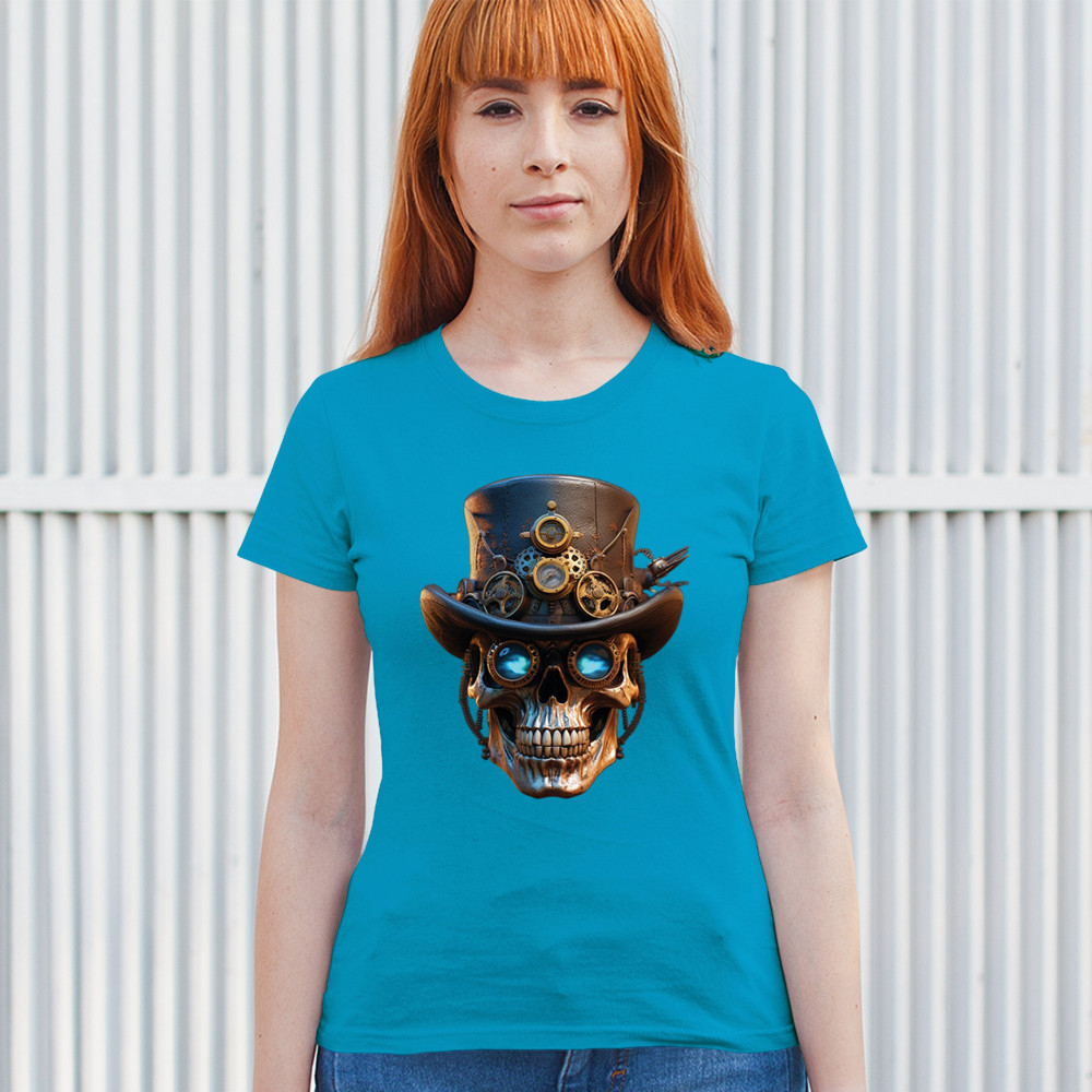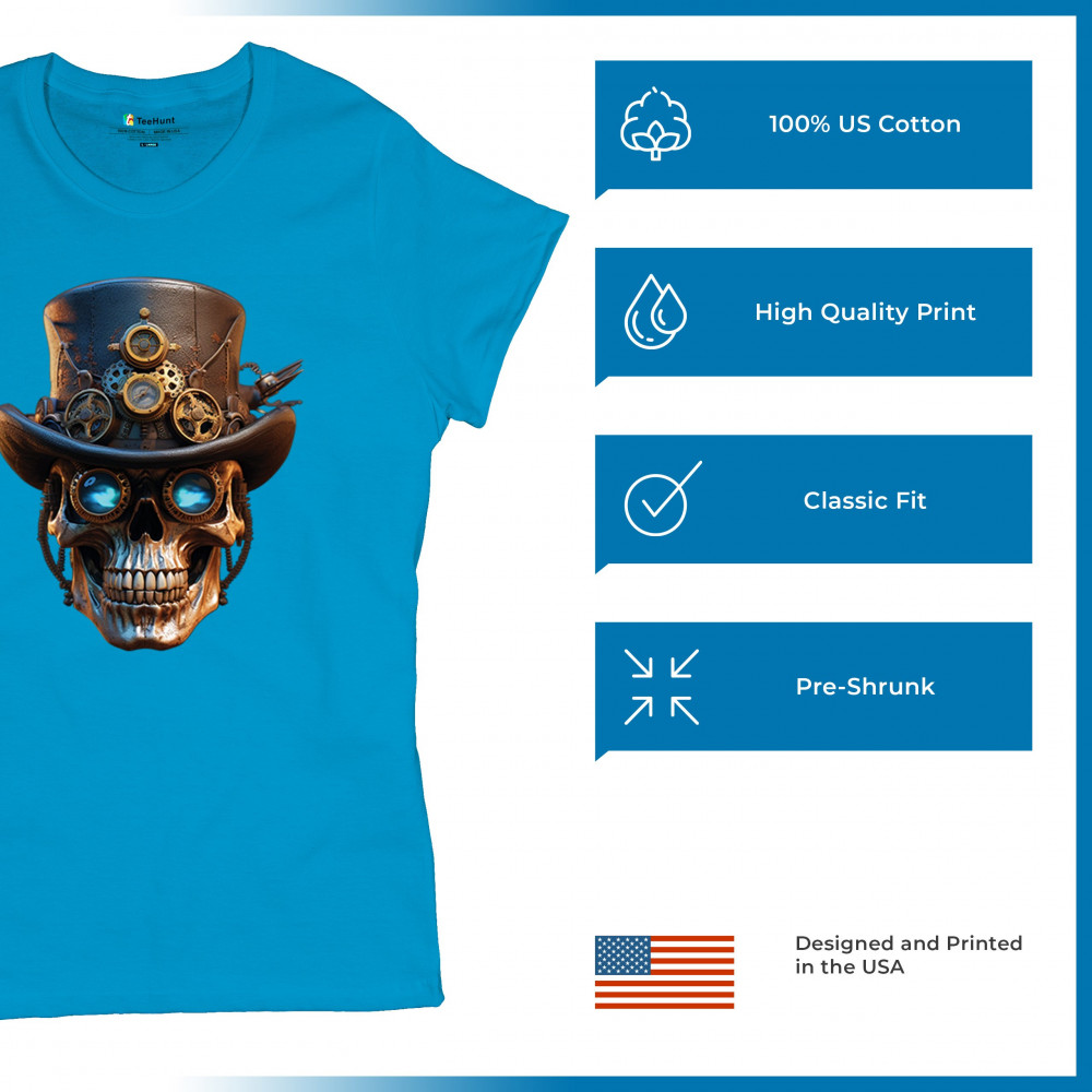 Steampunk skull shirt with gothic retro-futurism. Perfect for Halloween, cosplay, biker rallies, and edgy rebel fashion lovers.