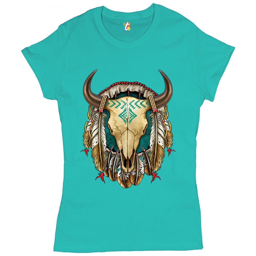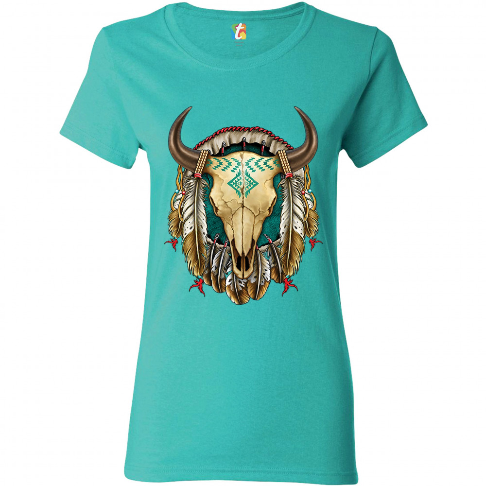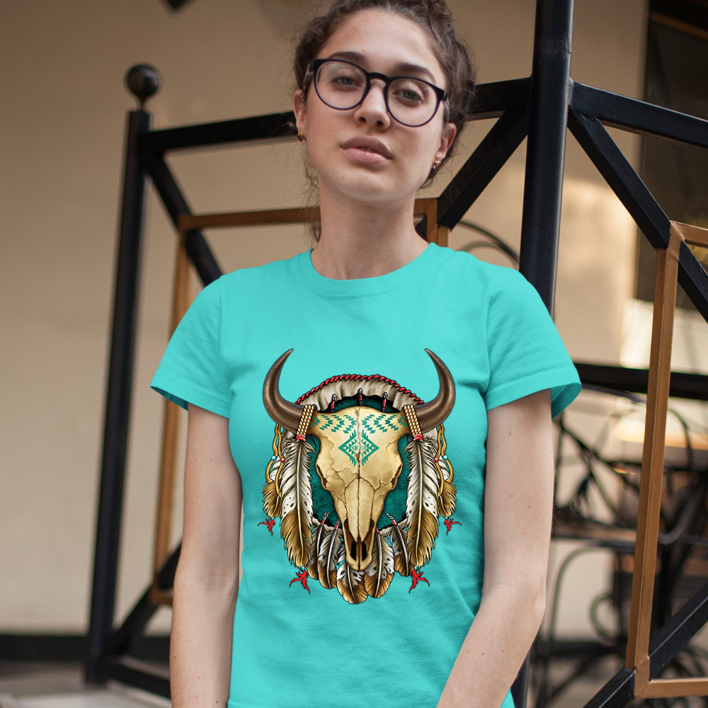 STEER SKULL DREAMCATCHER t-shirt native american indigenous culture women's tee light blue