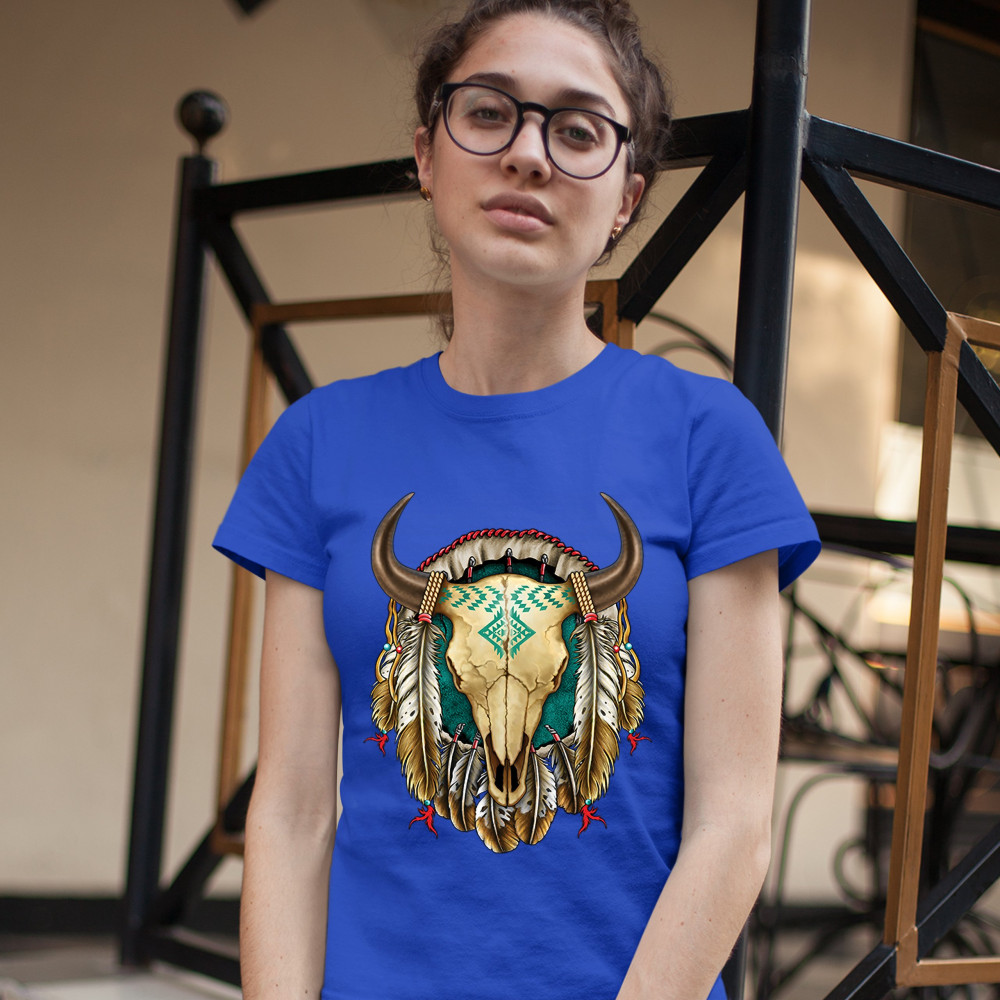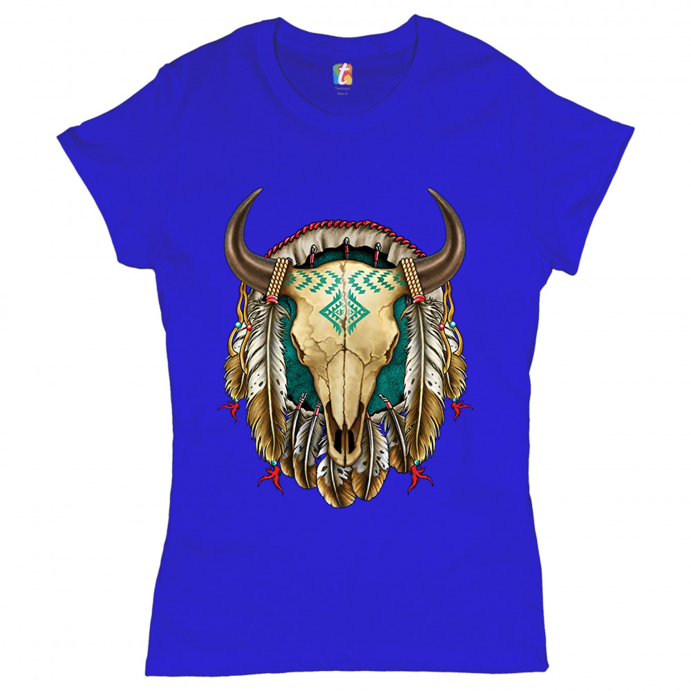 STEER SKULL DREAMCATCHER t-shirt native american indigenous culture women's tee royal blue