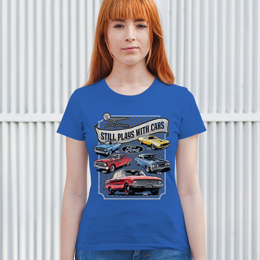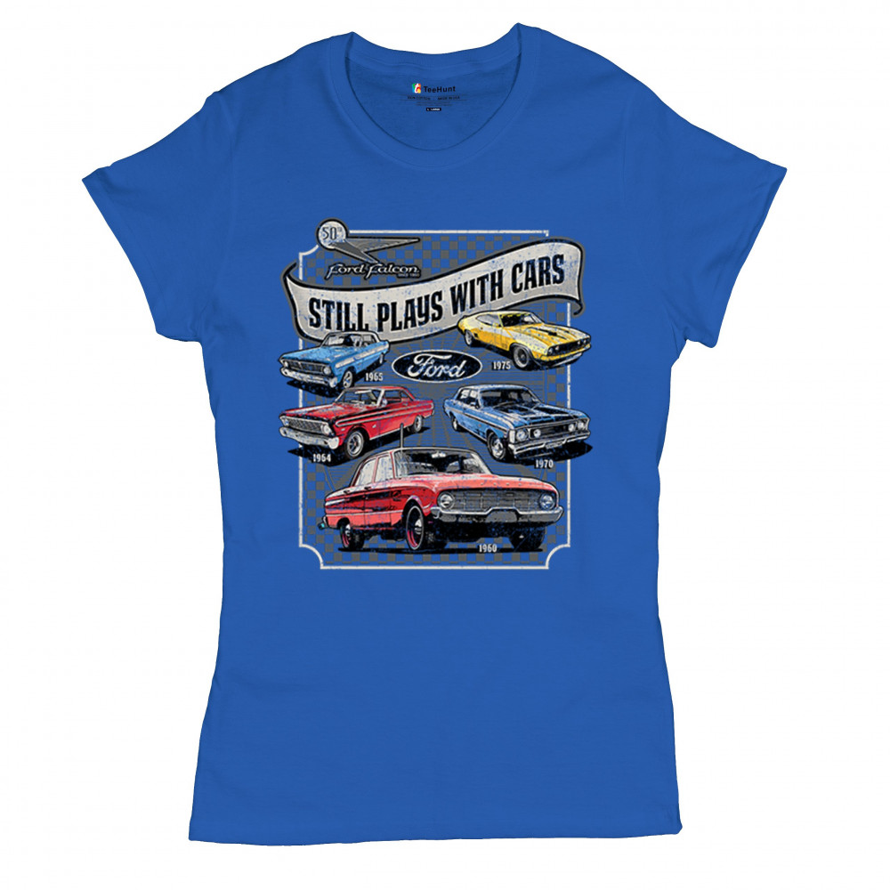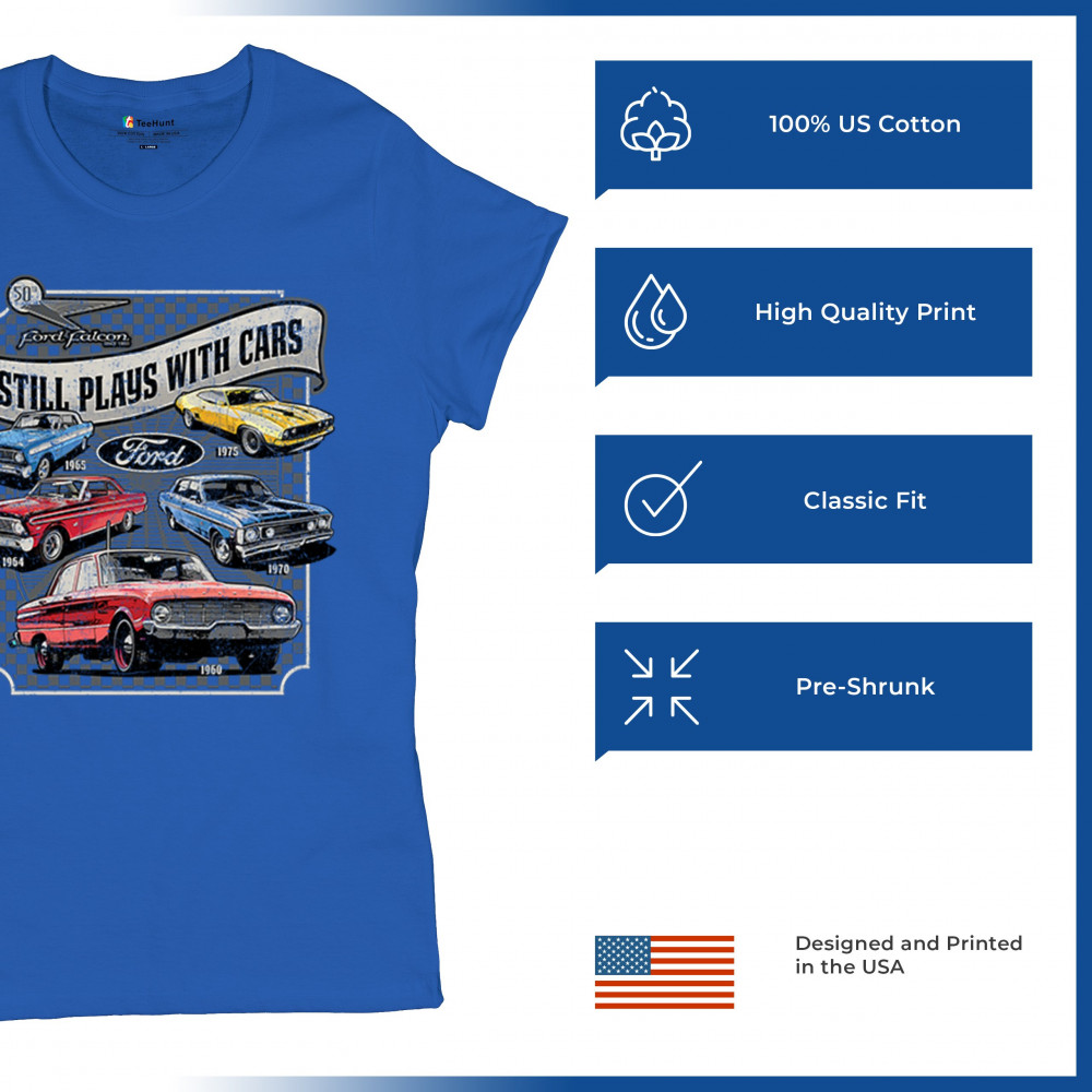 Still Plays With Cars pays tribute to the Ford Falcon, showcasing legendary models from the 60s and 70s for true vintage car lovers. Perfect for gearheads, hot rod fans, and classic car collectors, this design celebrates retro automobile culture, vintage horsepower, and old school rides. A great value piece for anyone devoted to the classic car scene.