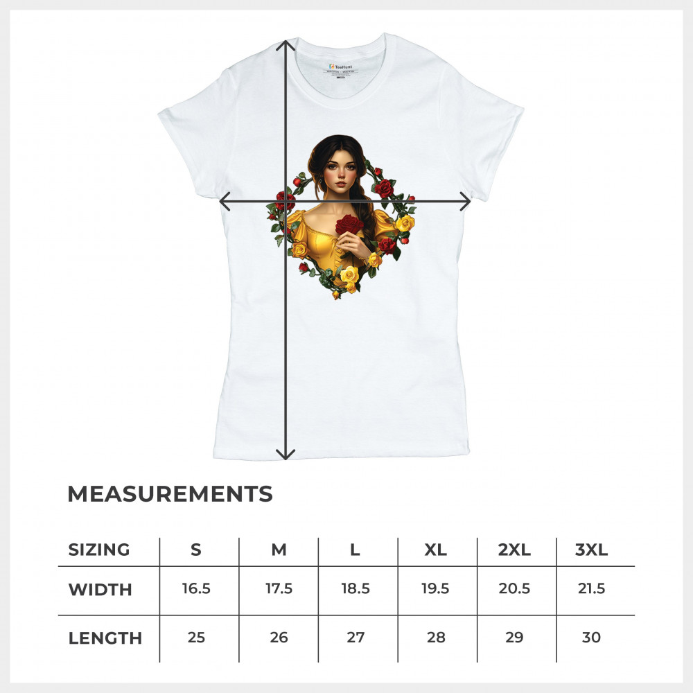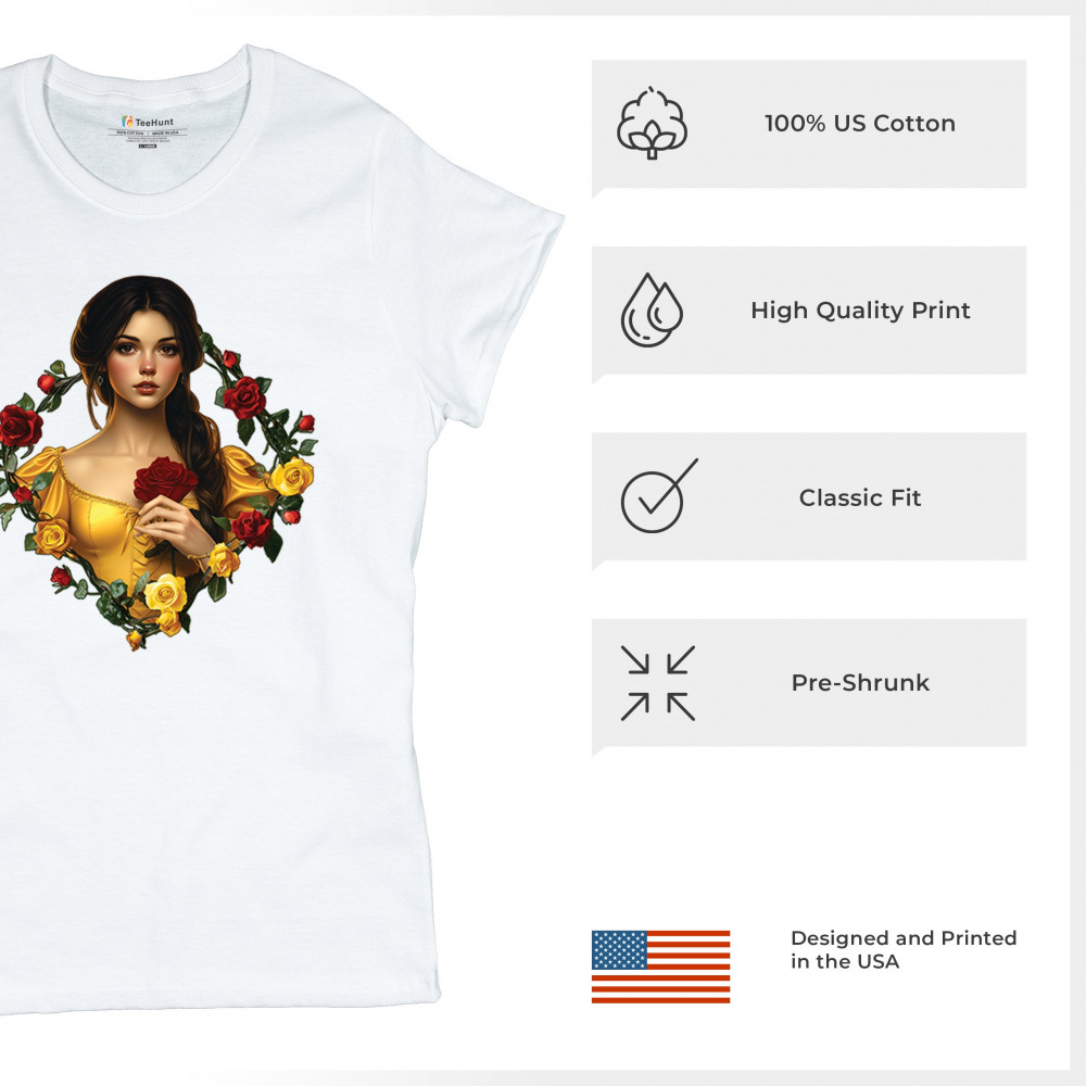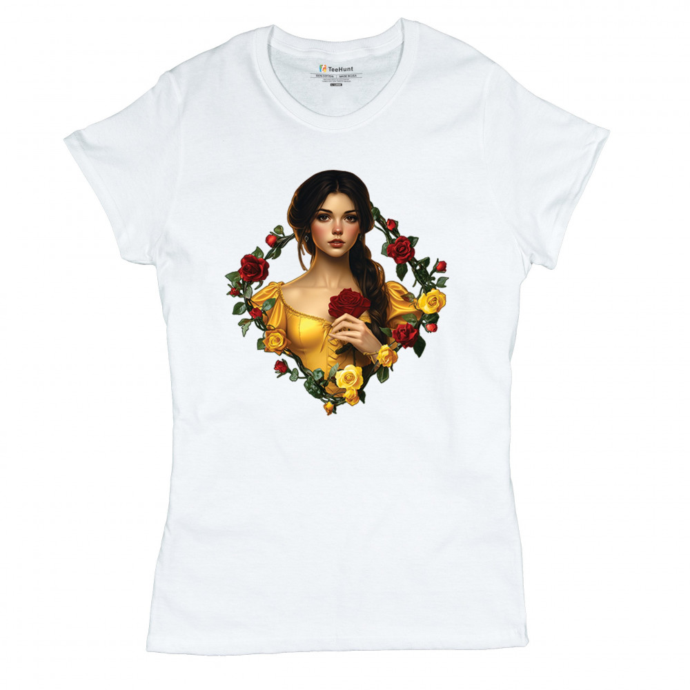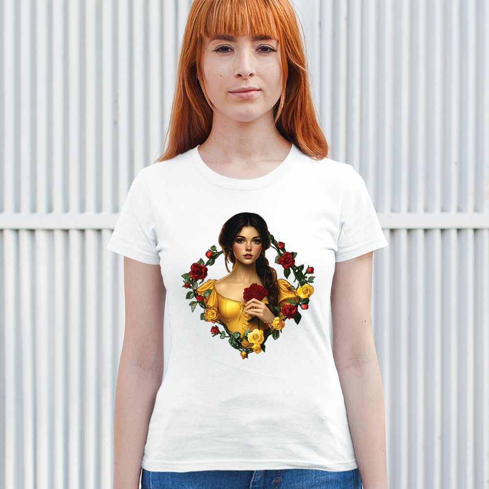 Inspired by classic fairytales, this design features a girl in a yellow gown holding a red rose, framed by rich red and yellow roses. A tribute to Beauty and the Beast, it radiates warmth, romance, and timeless fantasy. Perfect for storybook lovers, enchanted art collectors, or those drawn to magical, symbolic imagery filled with beauty and grace.
