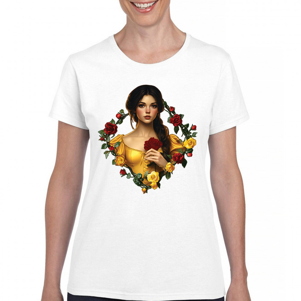 Romantic fantasy design of girl in yellow gown with red rose. Inspired by Beauty and the Beast, full of fairytale magic and classic charm.