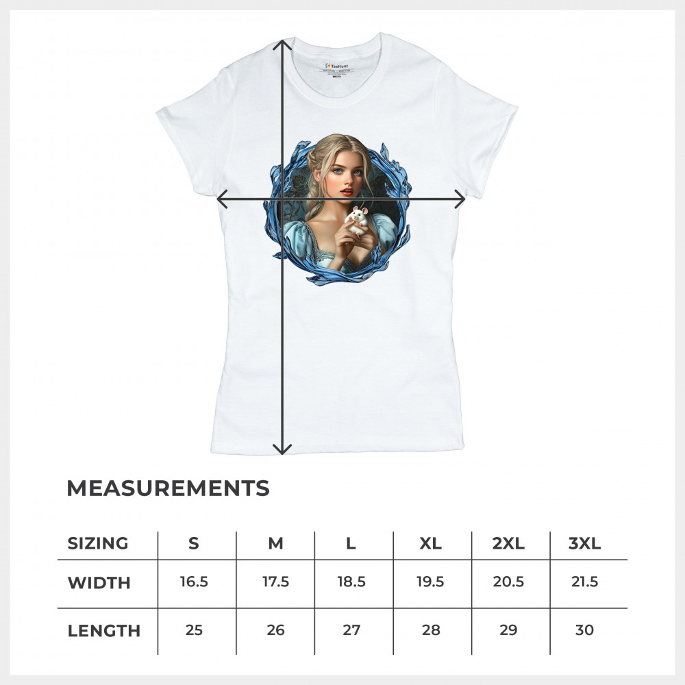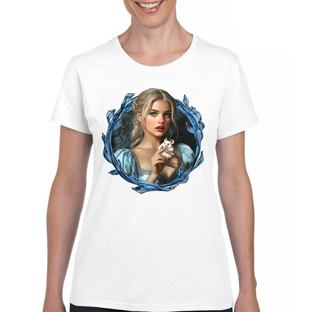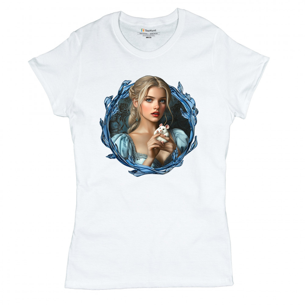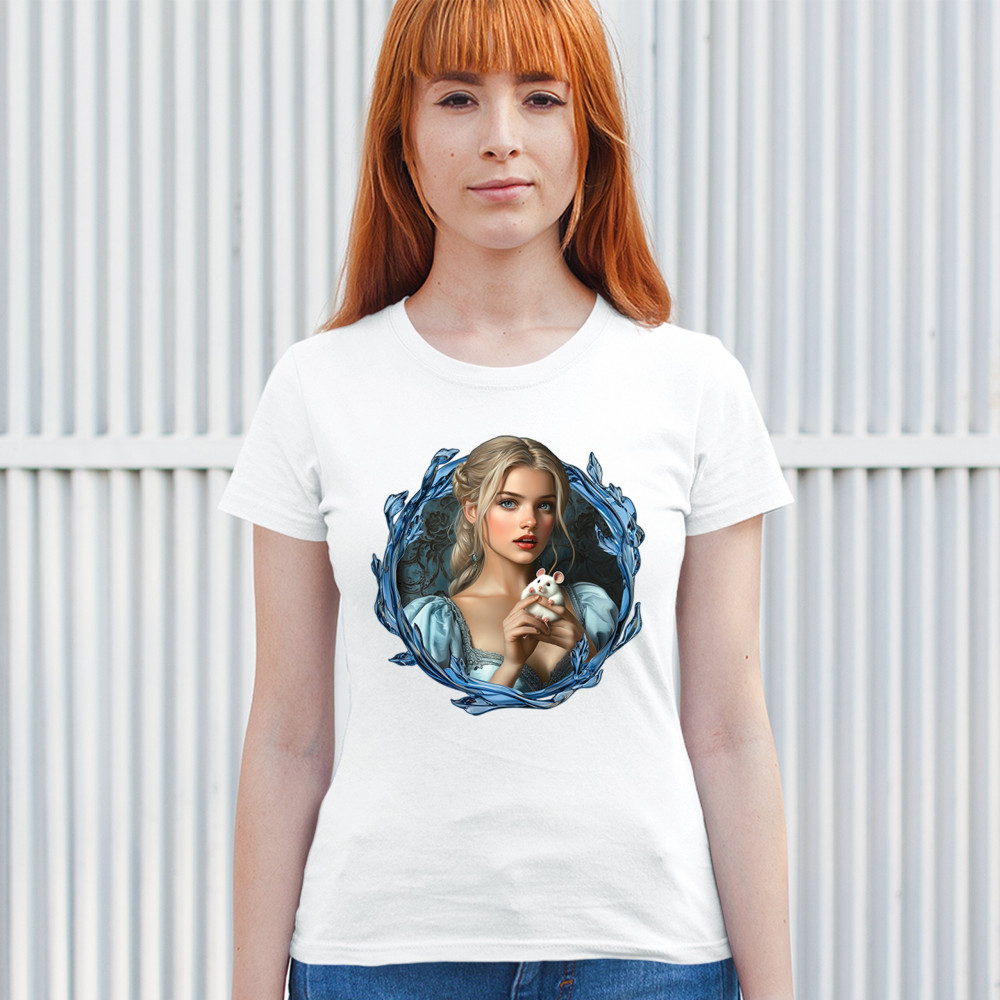 A whimsical design inspired by fairytales and Cinderella magic, featuring a blonde girl in a blue dress holding a white mouse. The icy blue leaf frame evokes enchantment and transformation. With soft, vintage tones and a dreamy feel, it’s a charming tribute to kindness, fantasy, animal companionship, and gentle storytelling magic.